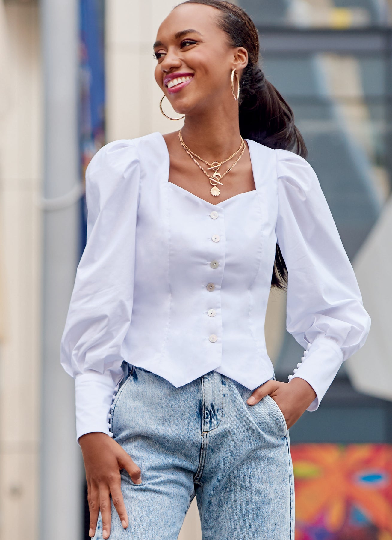 Geknöpftes Prärie-Bauerntop mit Puffärmeln für Damen. Saum: beschnitten, gerüscht und spitz. 3/4-Ärmel und lange Ärmel. Das Oberteil ist gefüttert und hat Prinzessnähte und einen herzförmigen Ausschnitt.