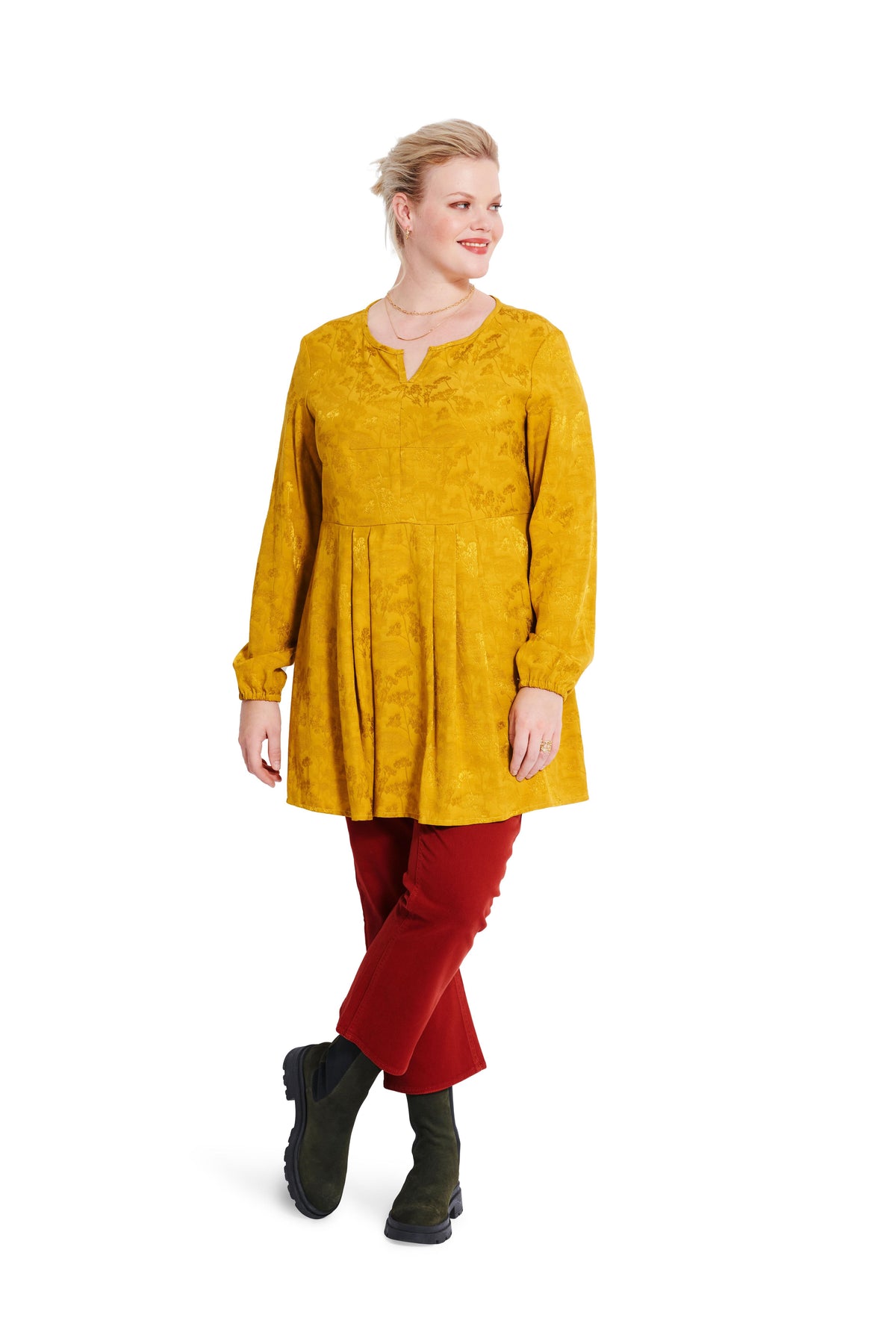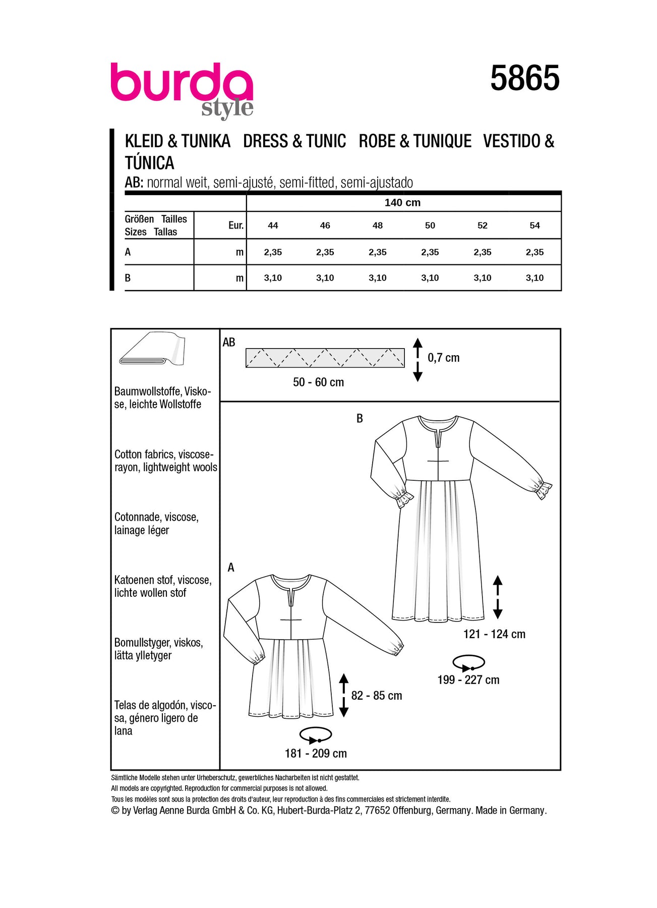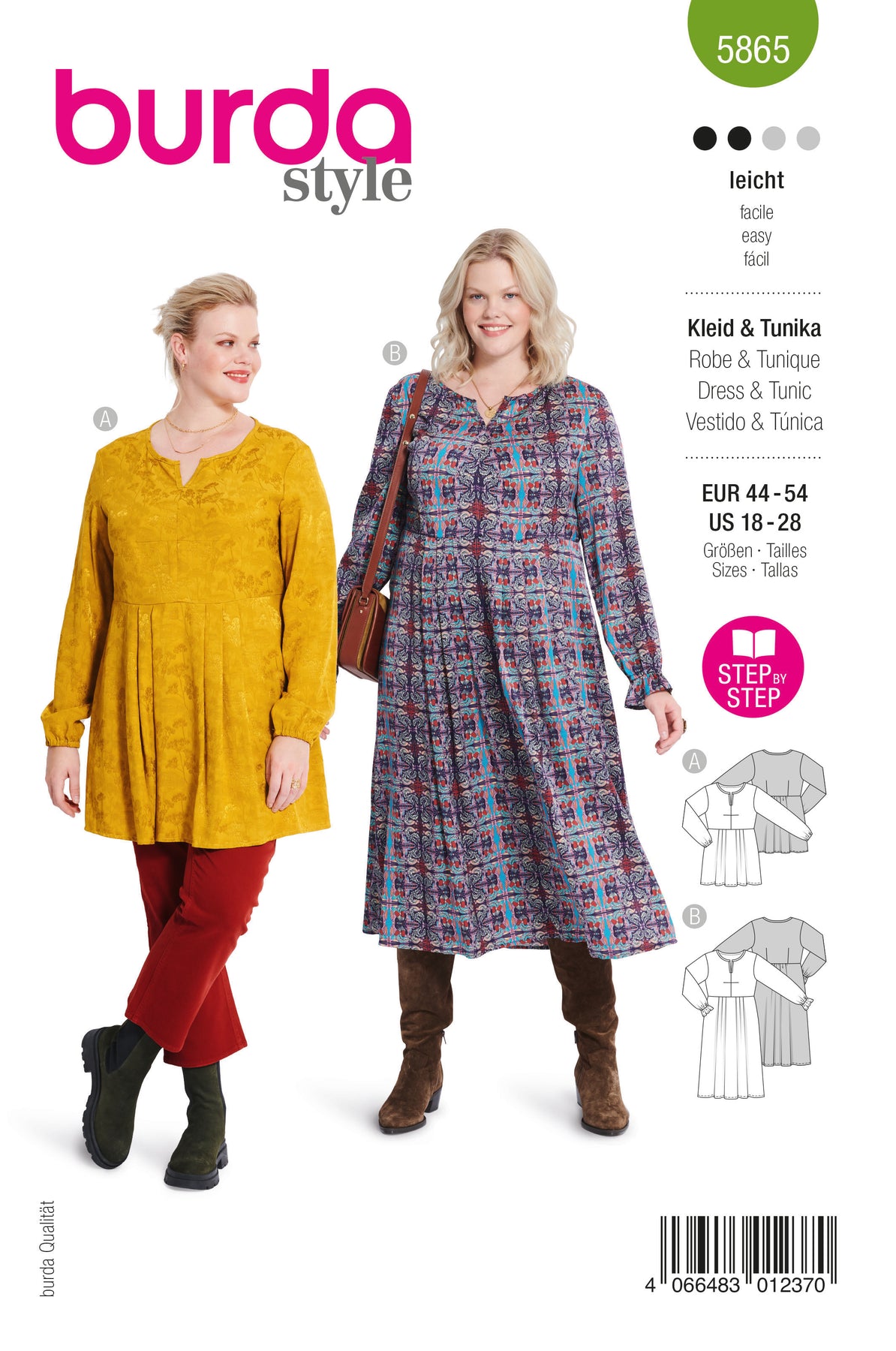 Tunika oder Kleid, beide Modelle gefallen mit rundem Ausschnitt, kleinem Schlitz und langen Ärmeln mit Gummidurchzug. Der etwas erhöht angesetzte Rock ist in kleine Fältchen gelegt, das ergibt den schönen Fall und umspielt die Taille.