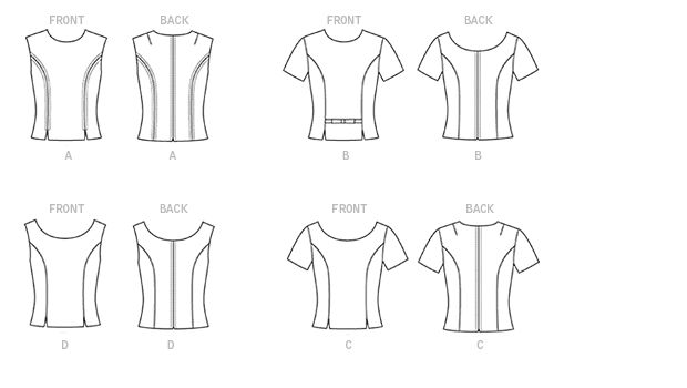 Das Oberteil (im Brustbereich eng anliegend) hat einen variablen Halsausschnitt, seitliche Prinzessnähte vorne und hinten, Schlitze am vorderen Saum und einen Reißverschluss hinten. A: Absteppung. B: Vorderer Gürtel, Schleife, Knoten. A, D: Ärmellos. B, C: Kurze Ärmel. A, B: Juwelenausschnitt. C, D: Rundhalsausschnitt. Um 1960