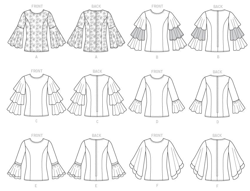 Taillierte Oberteile mit Prinzessnähten, Rückenreißverschluss und Ärmelvarianten. B: Kontrastierender Volant am mittleren Ärmel. E: Spitzenbesatz.