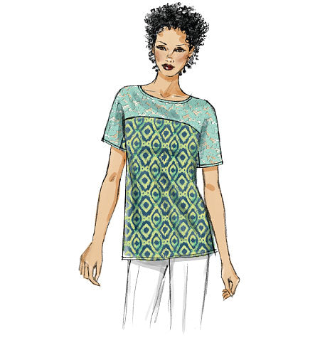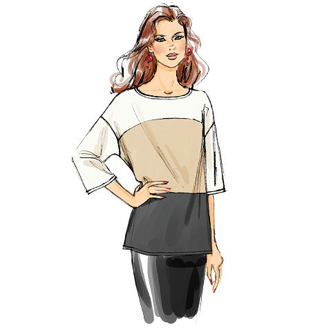 Locker sitzendes, pulloverartiges Oberteil mit schmalem Saum. B und C: Überschnittene Schultern. Gekauftes Schrägband schließt den Halsausschnitt ab.