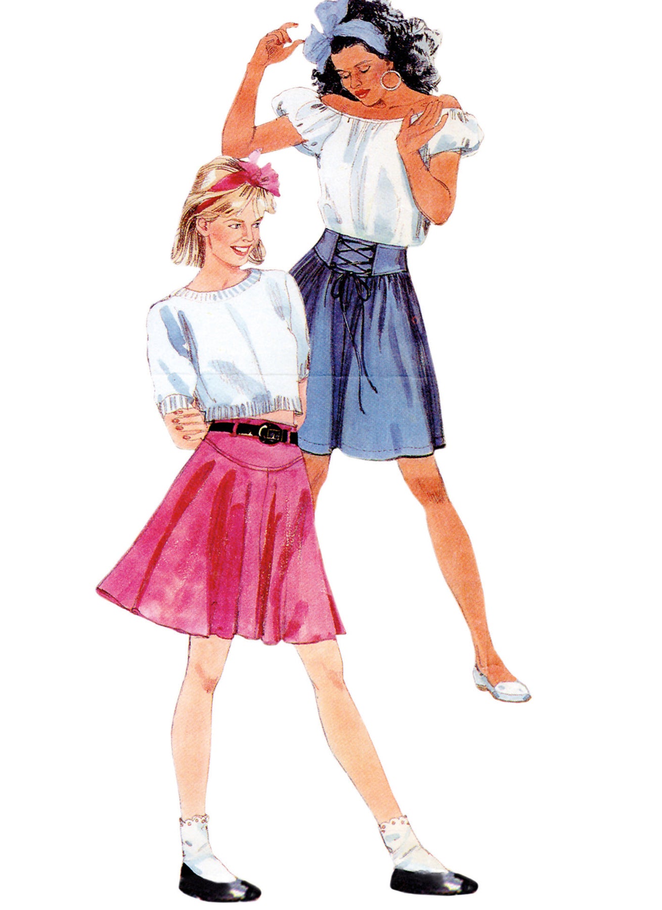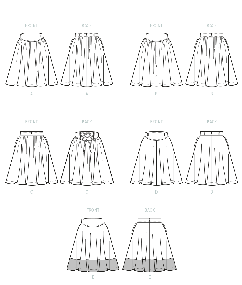 1980's Vintage Reissue Nähmuster. Die Röcke haben einen Formbund, einen Reißverschluss hinten und Seitennahttaschen. Die Ansichten A, B, C sind geraffte Röcke. Ansicht A hat Gürtelschlaufen. Ansicht B hat vorne eine Knopföffnung. Ansicht C hat eine Schnürung. Die Ansichten D und E sind ausgestellte Röcke. Ansicht E hat ein kontrastierendes unteres Band.