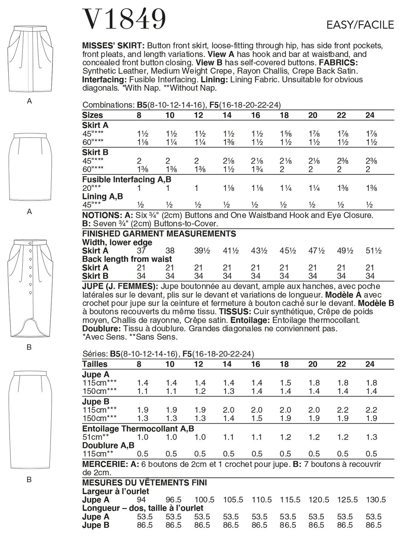 Synthetisches Leder, mittelschwerer Krepp, Viskose, Satin mit Krepprücken. Einlage: Aufbügelbare Einlage Futterstoff: Futterstoff. Nicht geeignet für offensichtliche Diagonalen. *Mit Flor **Ohne Flor ***Mit oder ohne Flor Hinweis: Der Stoff muss für Flor, einseitiges Design oder Schattierungen geeignet sein. Zusätzlicher Stoff kann zur Anpassung an ein geeignetes Design oder für Schrumpfung erforderlich sein. ANMERKUNGEN: A: Sechs 3/4"" (2 cm) Knöpfe und ein Haken- und Ösenverschluss am Bund. B: Sieben 3/4"" (2 cm) Knöpfe zum Abdecken der Formen".
