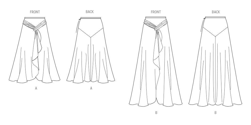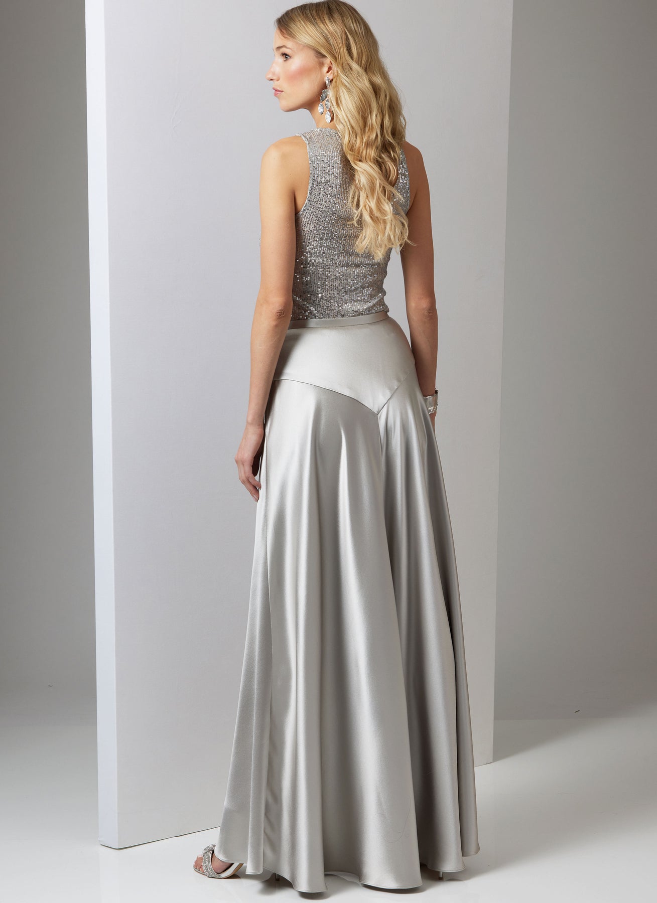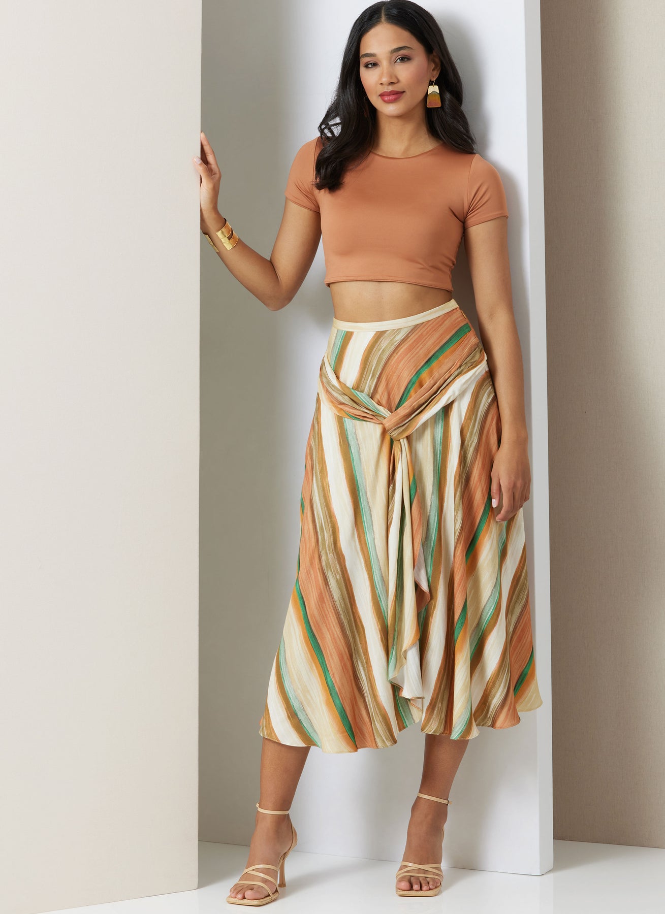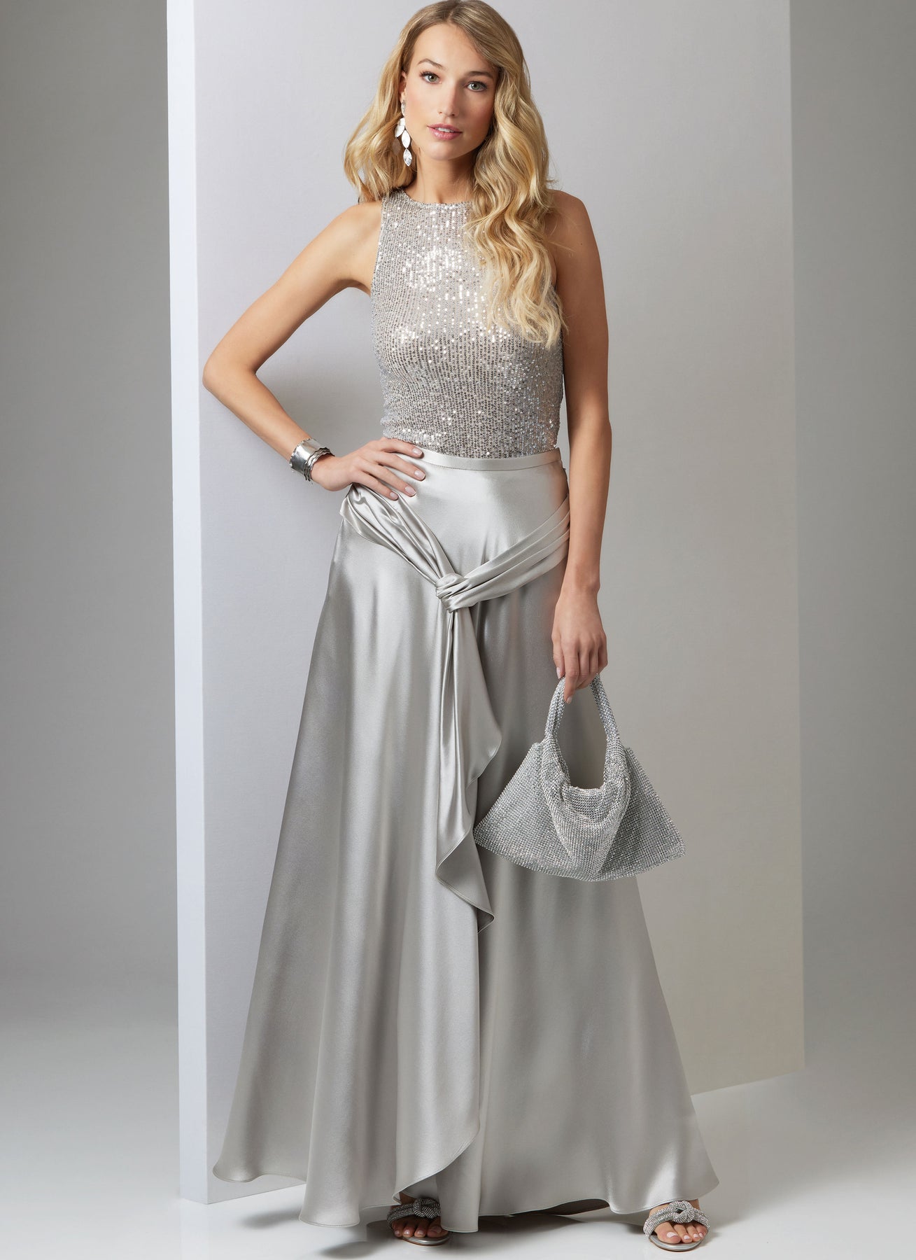 Drapierter, schräg geschnittener Rock mit schmalem Bund, unsichtbarem Seitenreißverschluss mit Haken und Riegel, 3/8"-Baby-Saum und Längenvariationen.