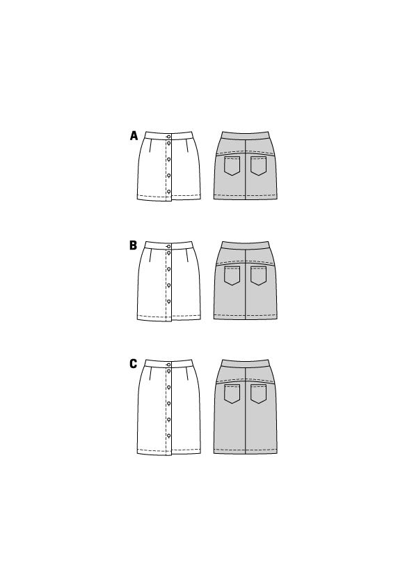 Stoffempfehlung:Jeansstoffe, Gabardine, Cord ABC: Aufbügelbare Einlage. AB: 5 Knöpfe. C: 6 Knöpfe.