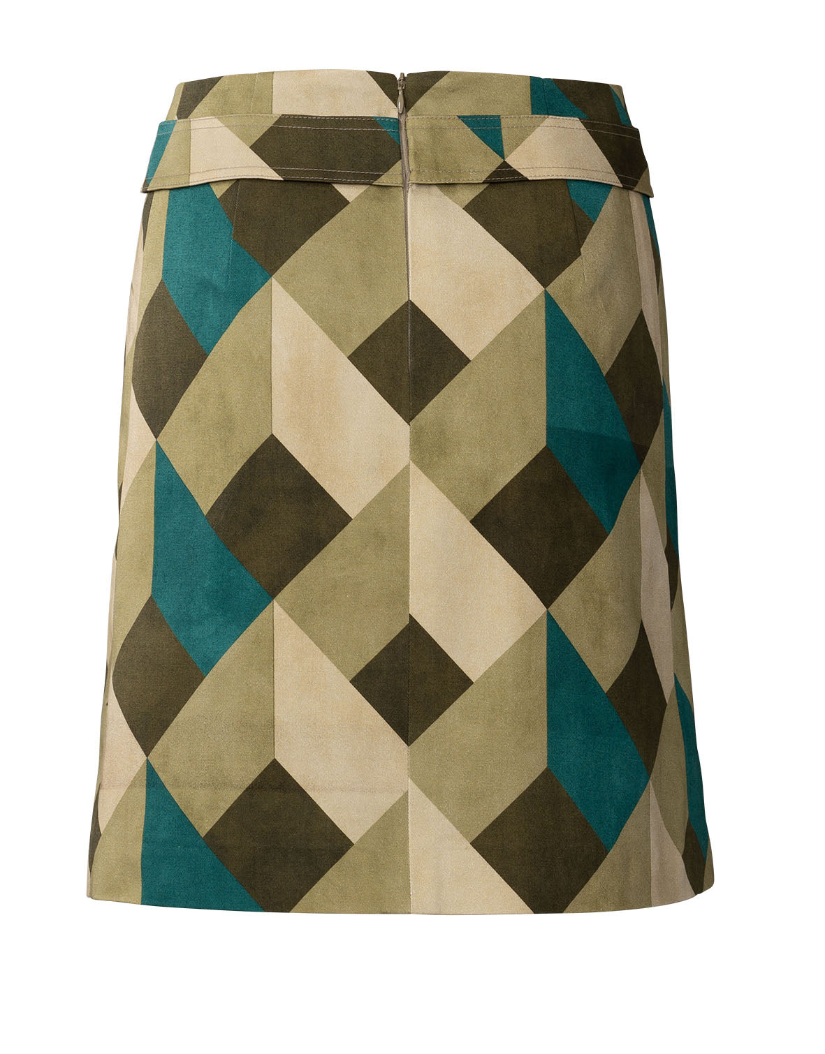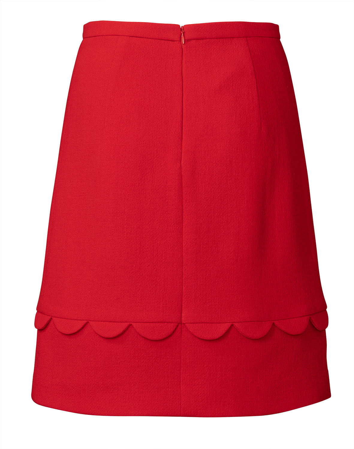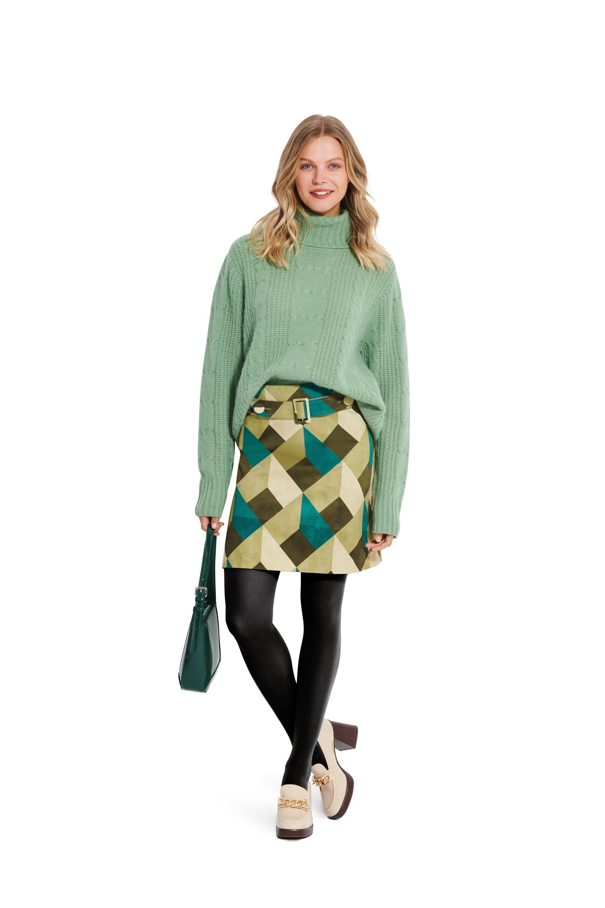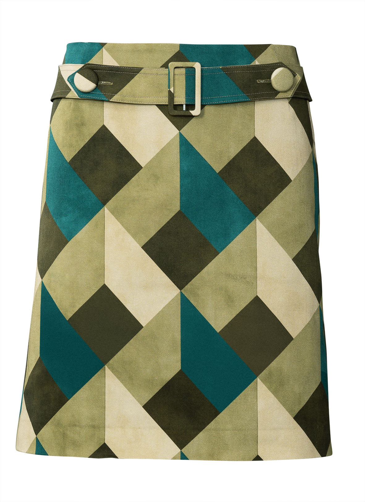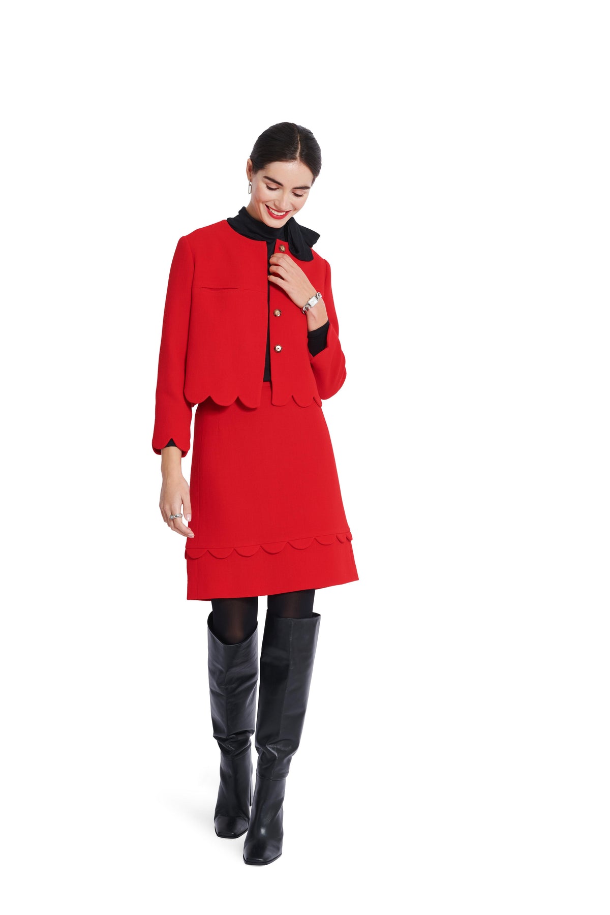 Zwei leicht ausgestellte Röcke mit seitl. Teilungsnähten. A mit dekorativem Formgürtel und Zierknöpfen. B mit schmalem Bund und hübscher Zierblende mit Bogenkante, die einfach in der Naht zwischengefasst wird. Tipp: mit dem passenden Jäckchen (Schnitt 5870) wird ein schickes Kostüm daraus.
