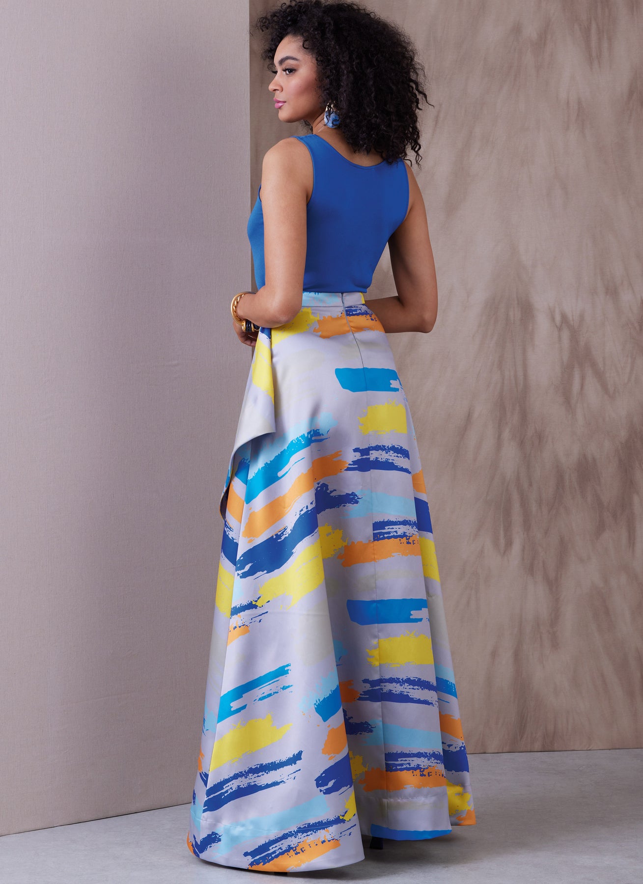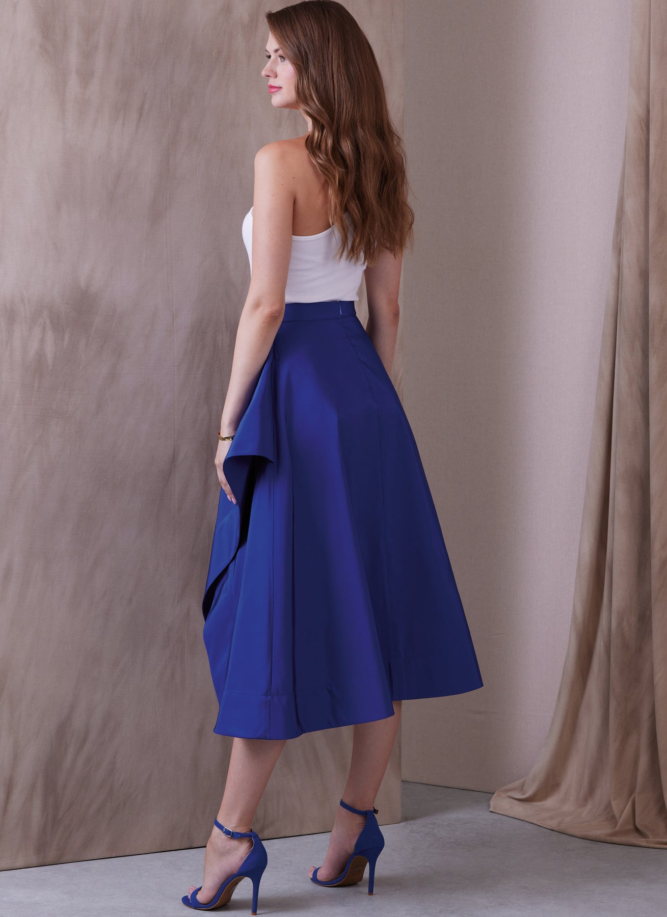 Voller asymmetrischer Rock im Querschnitt mit drapiertem Seitenschlitz, verdecktem Saum, Bund, unsichtbarem Reißverschluss hinten und Längenvariationen.