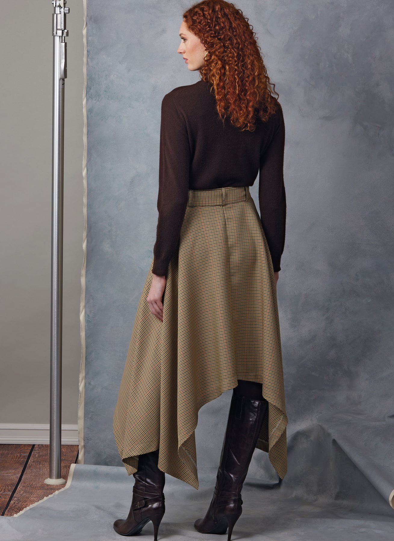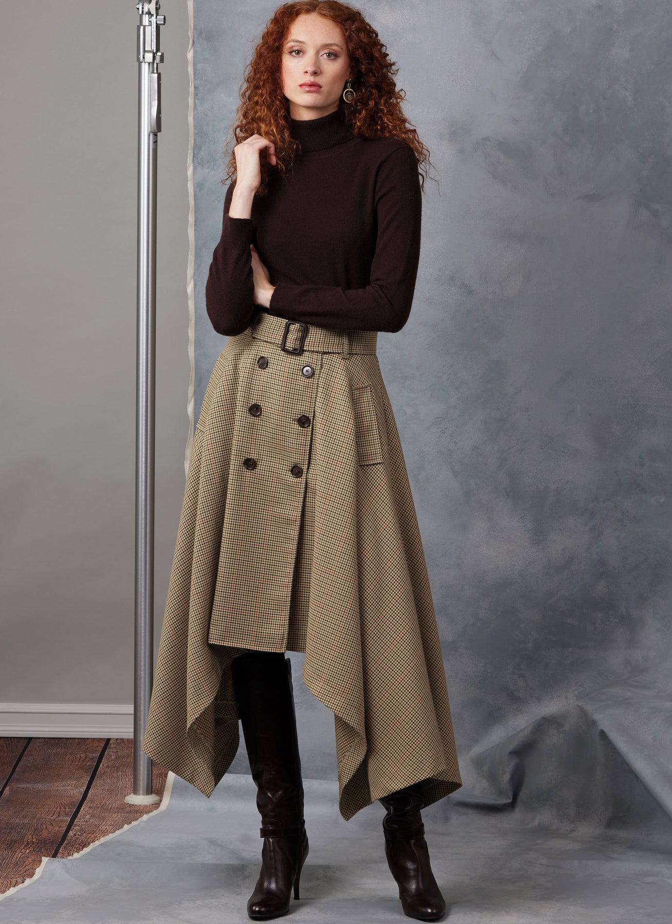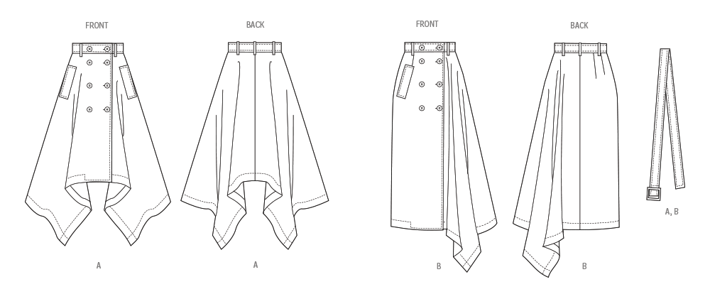 Trench-inspirierte Wickel-Midiröcke mit Knopfverschluss vorne, Gürtelschlaufen, passenden Gürteln, Leistentaschen und abgestepptem Saum. Ansicht A hat einen Taschentuch-Saum. Ansicht B hat ein asymmetrisches Drapierdetail.