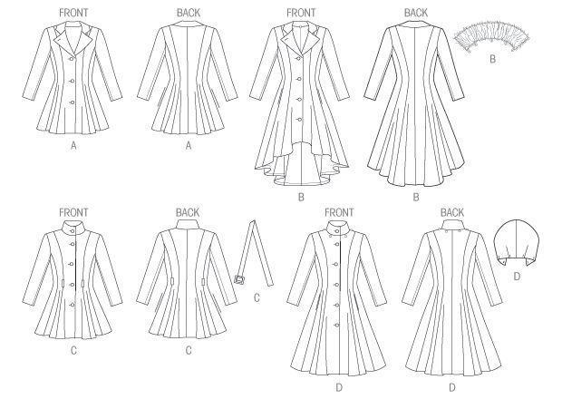 Damen gefütterte Mäntel, Gürtel, abnehmbarer Kragen und Kapuze: Taillierte und ausgestellte, gefütterte Mäntel haben Kragenvariationen, Nahtdetails, seitliche oder seitliche Vordertaschen und zweiteilige Ärmel. B: geformter Saum, gefütterter Kragen, abnehmbarer, gefütterter Kragen (elastische Schlaufe). C: Träger und Gürtel. D: abnehmbare, gefütterte Kapuze.