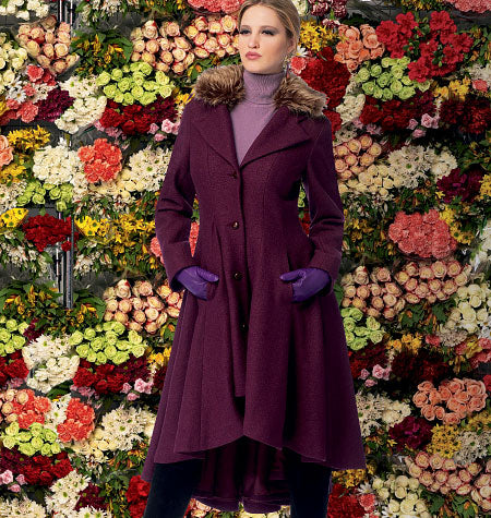 Konzipiert für mittelschwere bis schwere Webstoffe. STOFFE: Gekochter Flanell, Wollflanell, Woll-Gabardine, Tweeds. Auch B-Kragen: Pelzimitat. Futter: Gefütterte Stoffe.