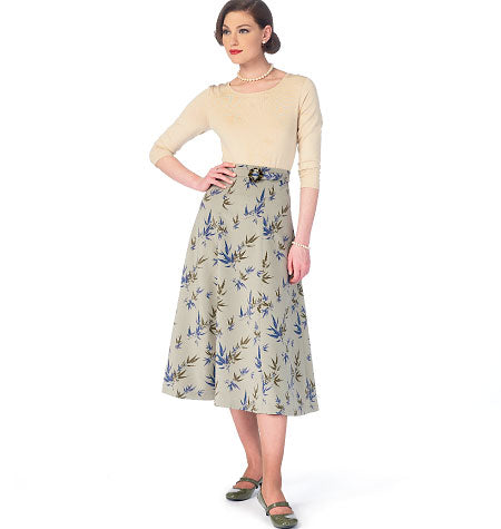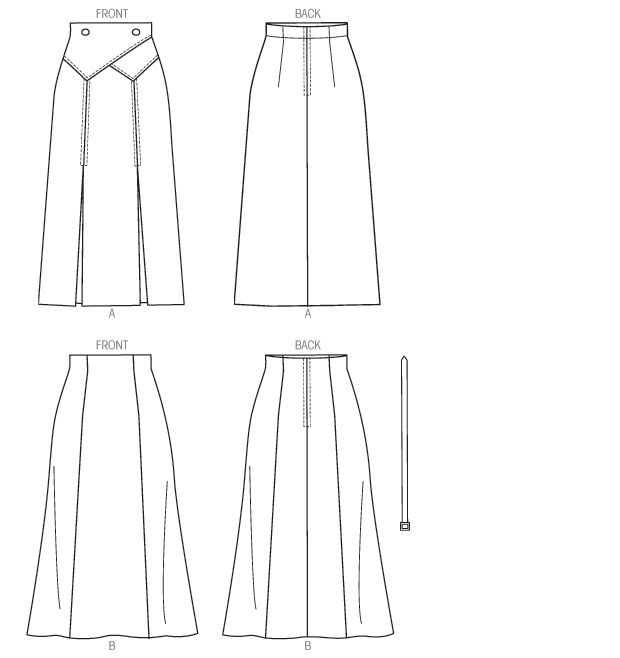 Röcke mit erhöhter Taille und Reißverschluss hinten. A: halb tailliert, gefütterte Passe vorne und Bund hinten, Faltenunterlegung vorne, Knopfleiste und Steppnähte. B: locker sitzend, mit Prinzessnähten und eigenem Gürtel.