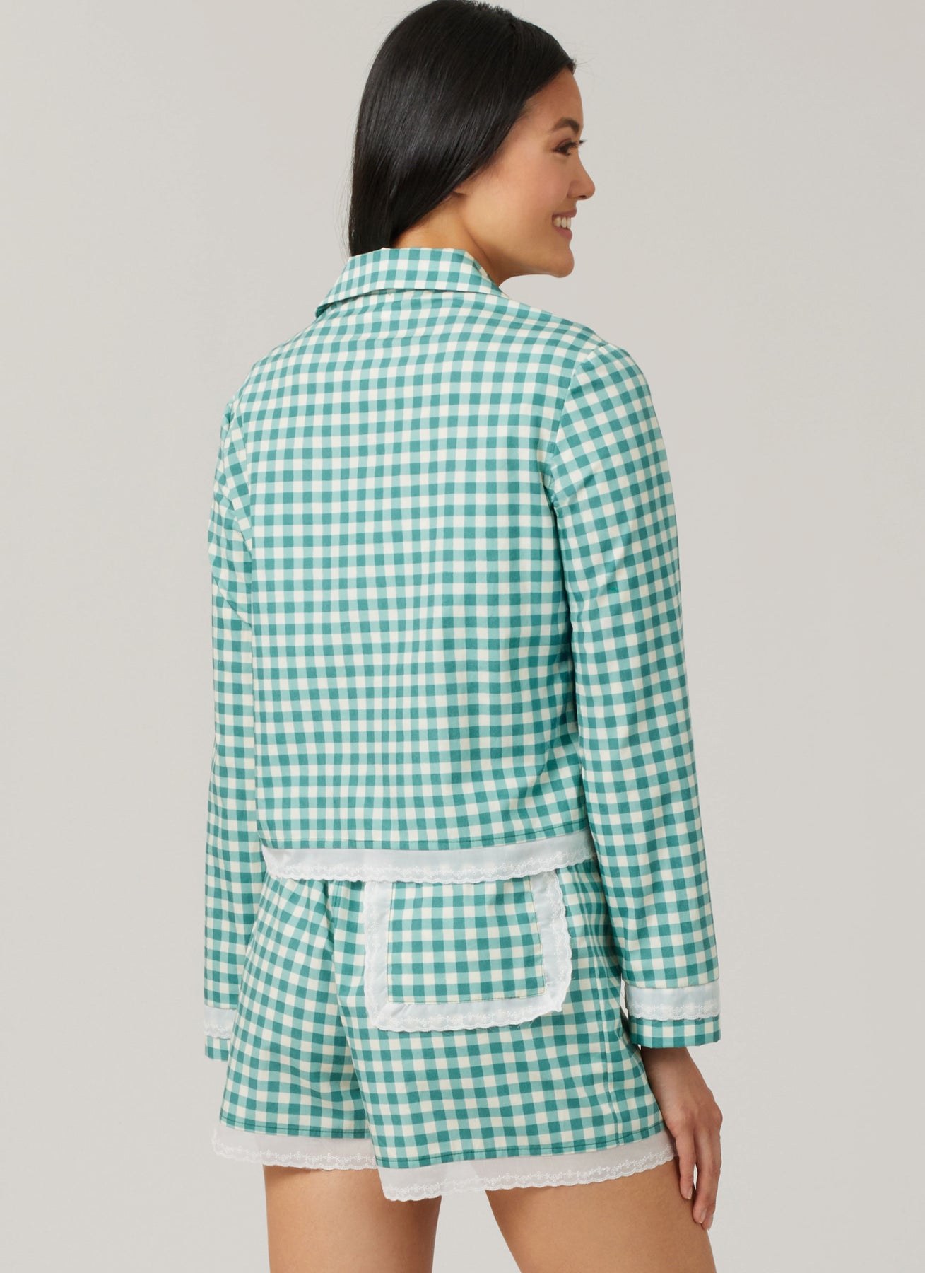Das Bralette bezaubert mit gerüschten Trägern und feinen Gummizügen an Ausschnitt und Saum, das Hemd besticht durch klassischen Kragen, Manschettenärmel und Brusttasche, und die Shorts sorgen dank elastischem Bund und Bindebändern für eine bequeme Passform. Die Wellenborte als dekoratives Detail verleiht allen Modellen einen femininen Vintage-Touch.