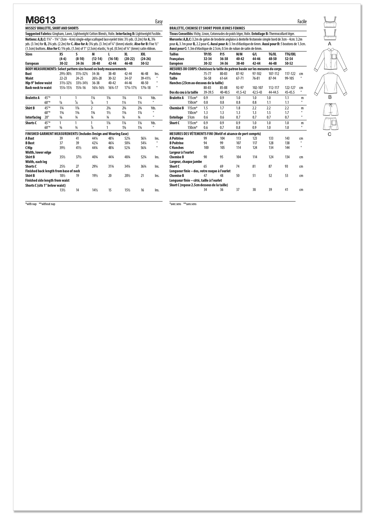 McCalls Schnittmuster M8613 Damen-Bralette (BH), Hemd und Shorts