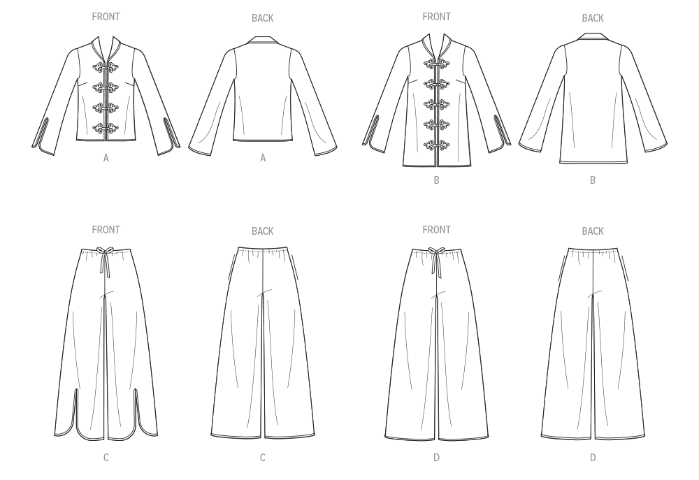 Halb taillierte Oberteile haben einen Schalkragen, Knotenverschlüsse vorne und ausgestellte, geteilte Ärmel. Die leicht ausgestellte Hose hat einen Gummizug in der Taille, Selbstbinder und Seitentaschen. Ansicht C hat einen Schlitz vorne an den Beinen.