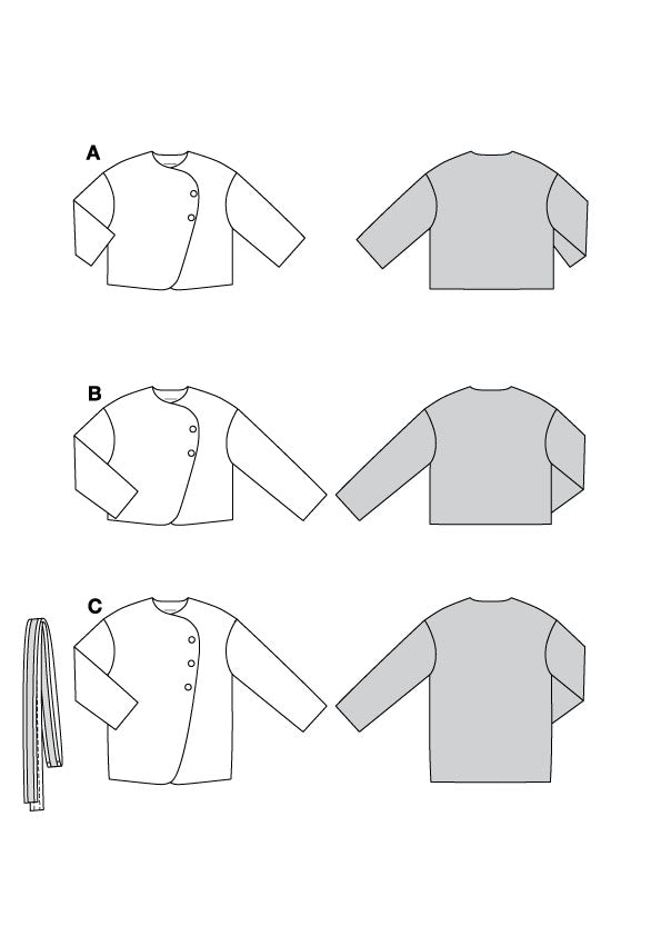 Stoffempfehlung:Wollstoff, Jaquard, Teddyplüsch ABC: Aufbügelbare Einlage. AB: 2 Knöpfe, 2 Druckknöpfe. C: 3 Knöpfe, 3 Druckknöpfe. B: Webband 2,5 cm breit: 1,65 - 1,95 m.