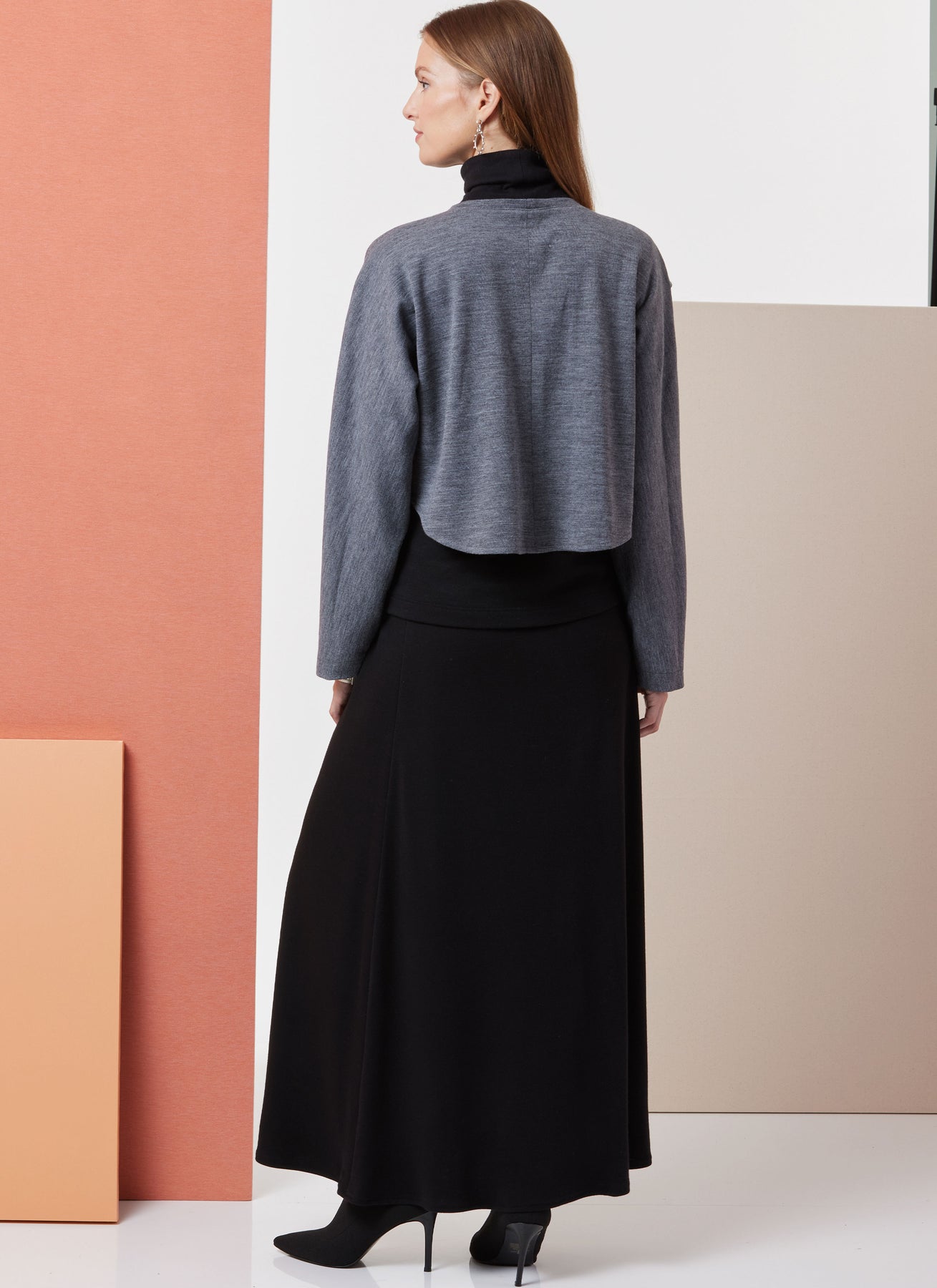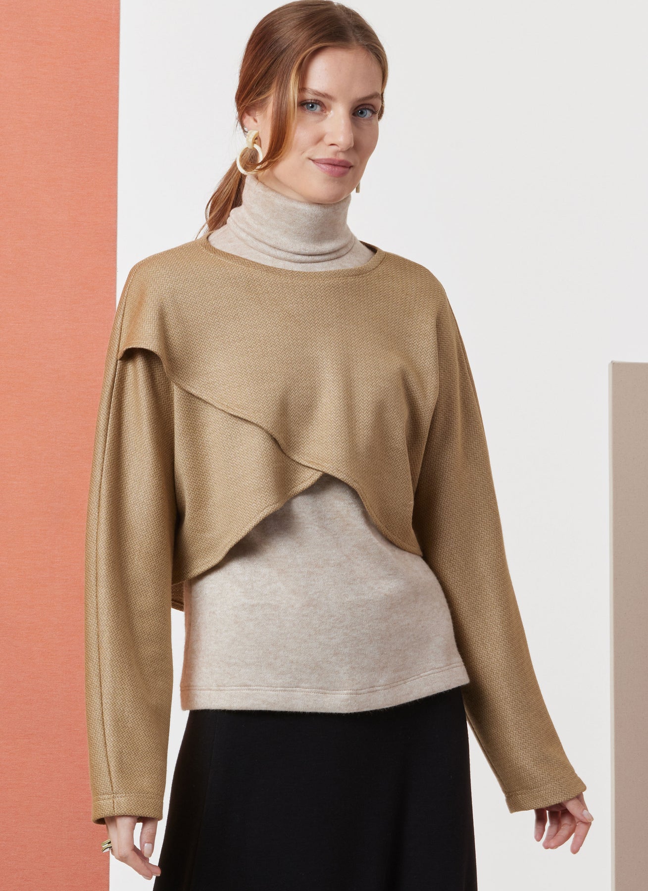 Locker sitzendes Oberteil, Ansicht A, mit überkreuzter Vorderseite, Hi-lo-Saum und Kragenband. Das eng anliegende Oberteil B zum Überziehen hat einen Rollkragen, lange eingesetzte Ärmel und Brustabnäher. Rock und Hose zum Überziehen haben einen elastischen Bund.