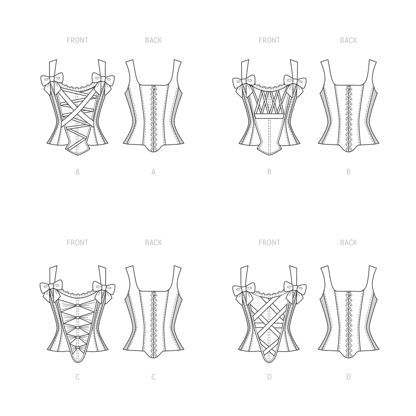 Boned corsets with ribbon and lace trim have spandex side panels for ease of movement and comfort. Back opening has faux lacing that conceals separating zipper. Separate pattern pieces for A/B, C and D cup sizes.