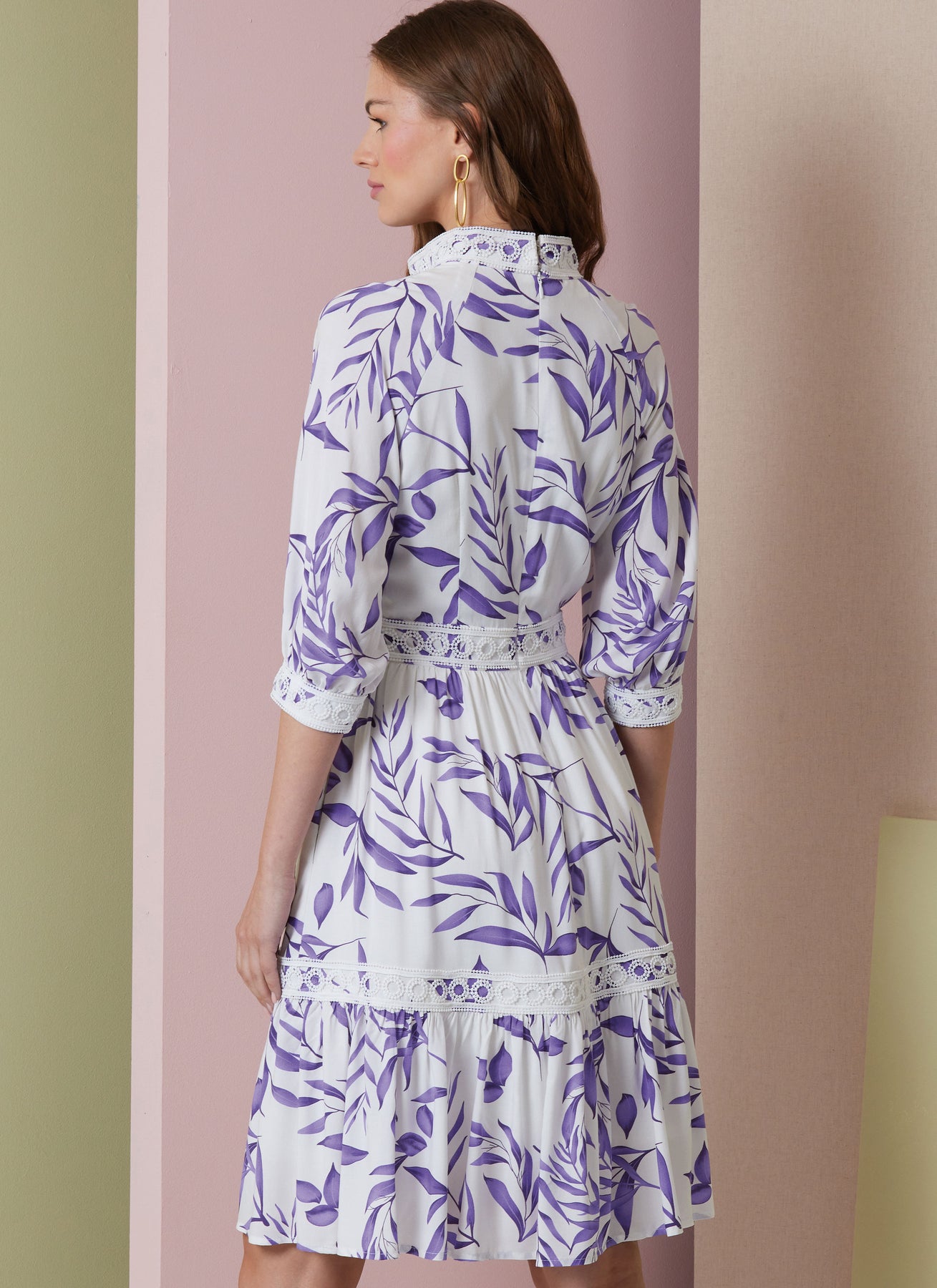 Gefütterte Kleider, die im Brustbereich tailliert sind, haben Raglanärmel, einen Knopf und eine Schrägbandschlaufe vorne, einen unsichtbaren Reißverschluss hinten und einen Haken- und Ösenverschluss. Ansicht A hat einen ausgestellten Rock mit Rüschensaum, Seitennahttaschen, abgesteppte Säume und unter dem Ellbogen liegende Ärmel mit Tonnenmanschetten. Ansicht B hat lange Ärmel, eine durchgehende Öffnung im Schoß, Knopf- und Schleifenverschluss an den Manschetten.