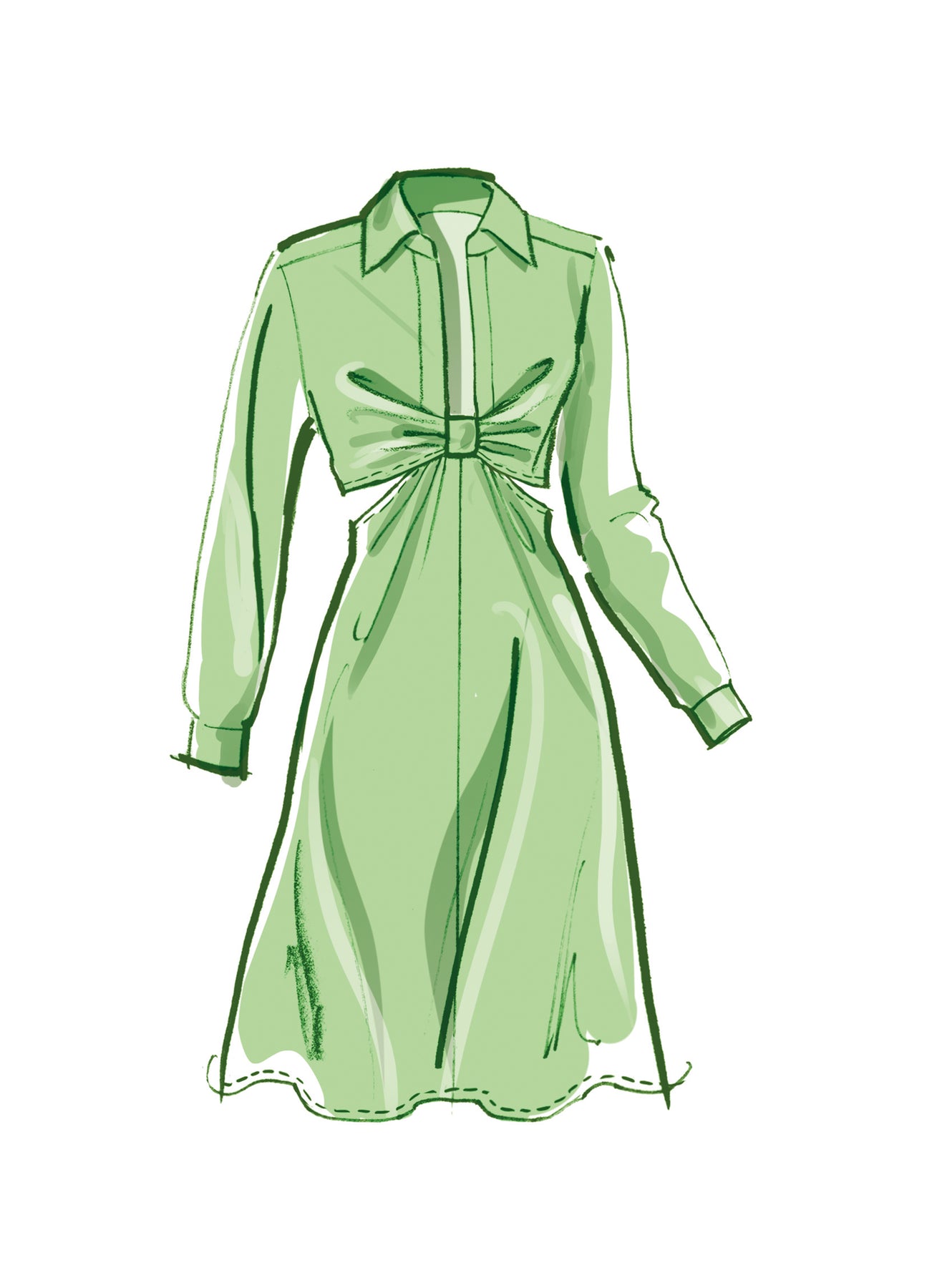 Geknotetes Hemdkleid mit Ärmel- und Längenvariationen. Das Kleid hat einen seitlichen Taillenausschnitt, einen Kragen, einen Stehkragen, eine doppelte Passe, Bänder vorne und einen unsichtbaren Reißverschluss hinten.