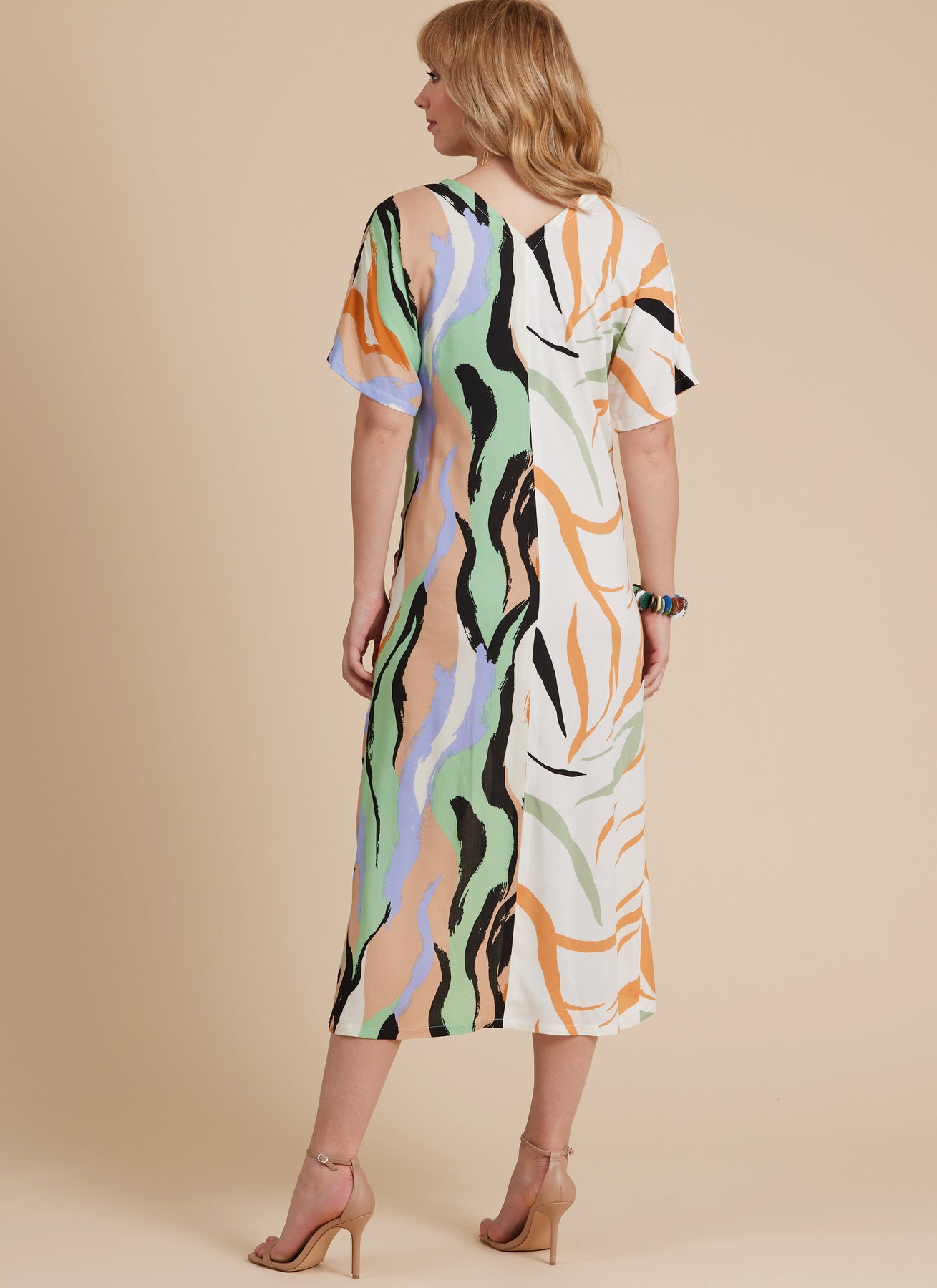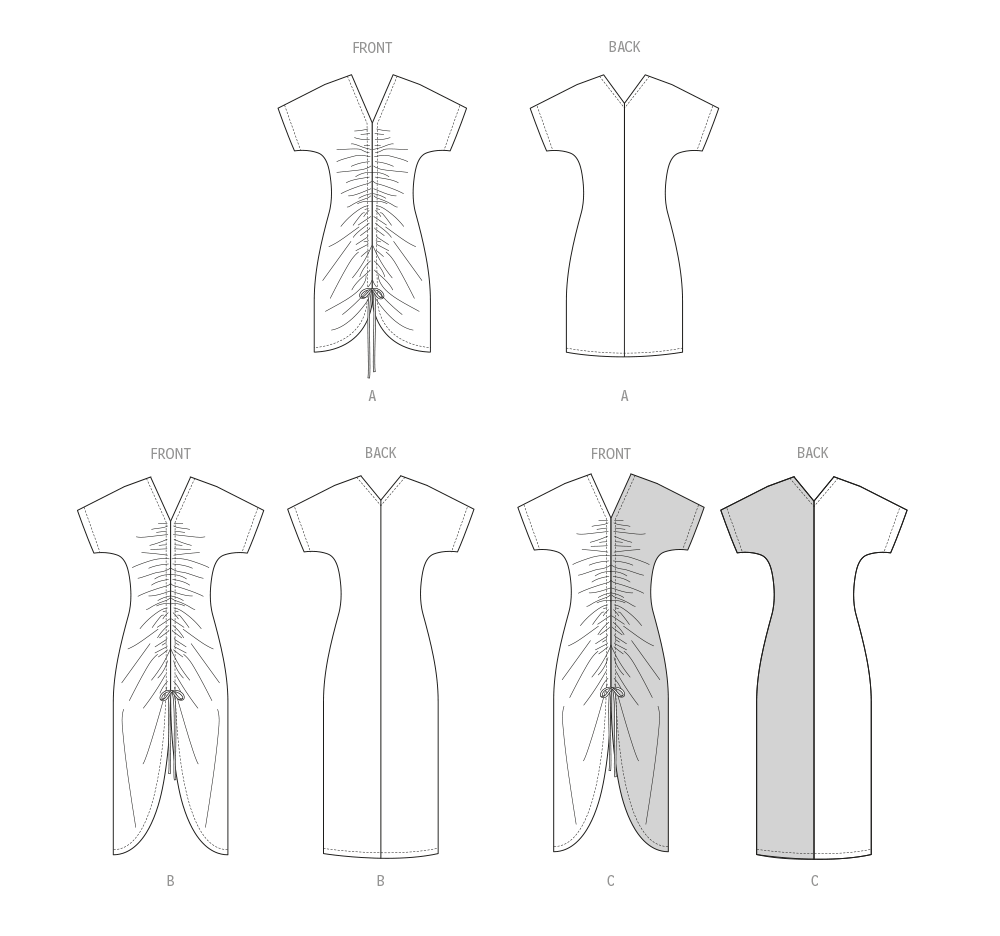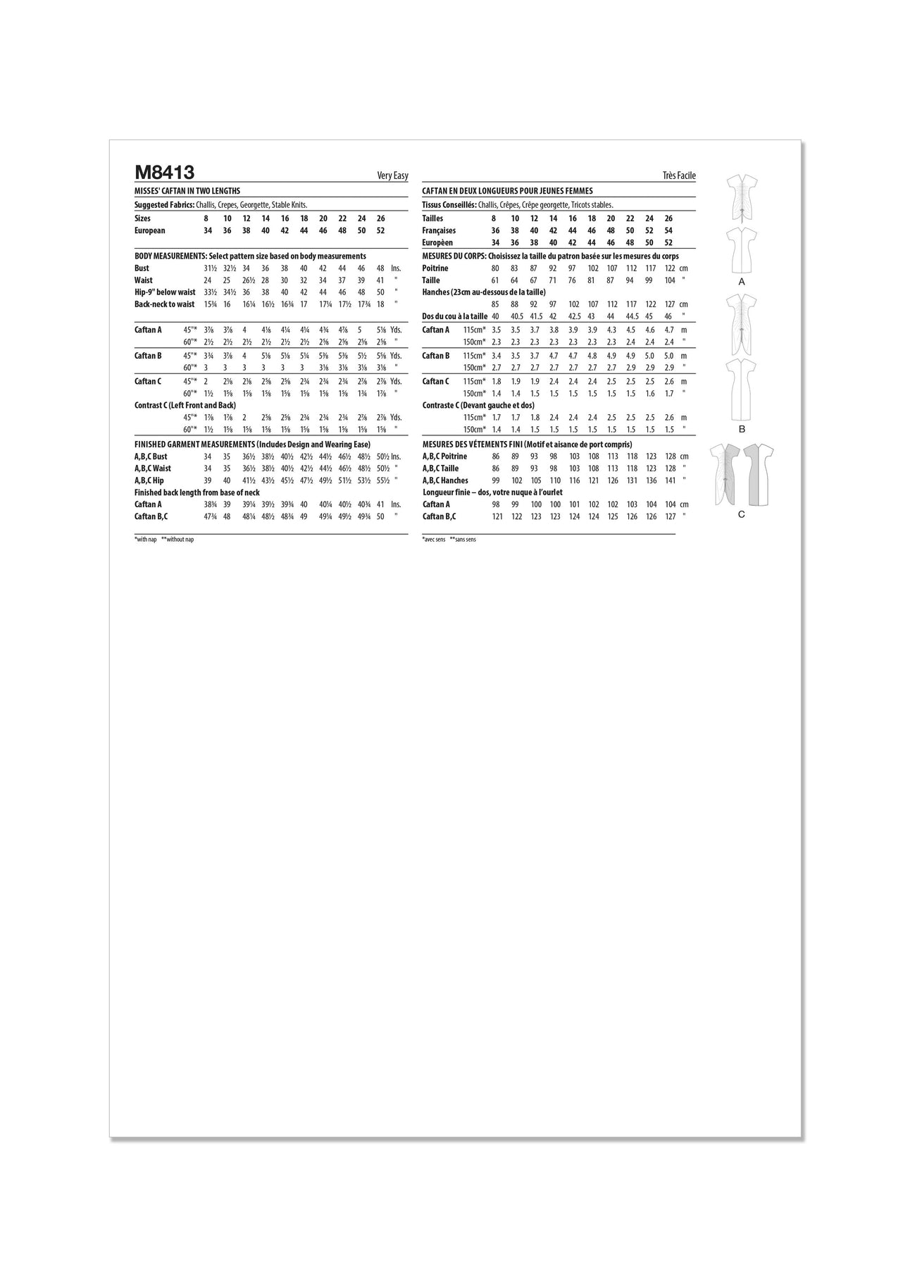 Der leicht zu nähende Kaftan in zwei Längen hat ein gerafftes Vorderteil mit Kordelzug, der unten gebunden wird, einen V-förmigen Ausschnitt, Dolman-Ärmel und einen schmalen Saum. Ansicht C Kaftan hat einen Kontrast auf der linken Seite.
