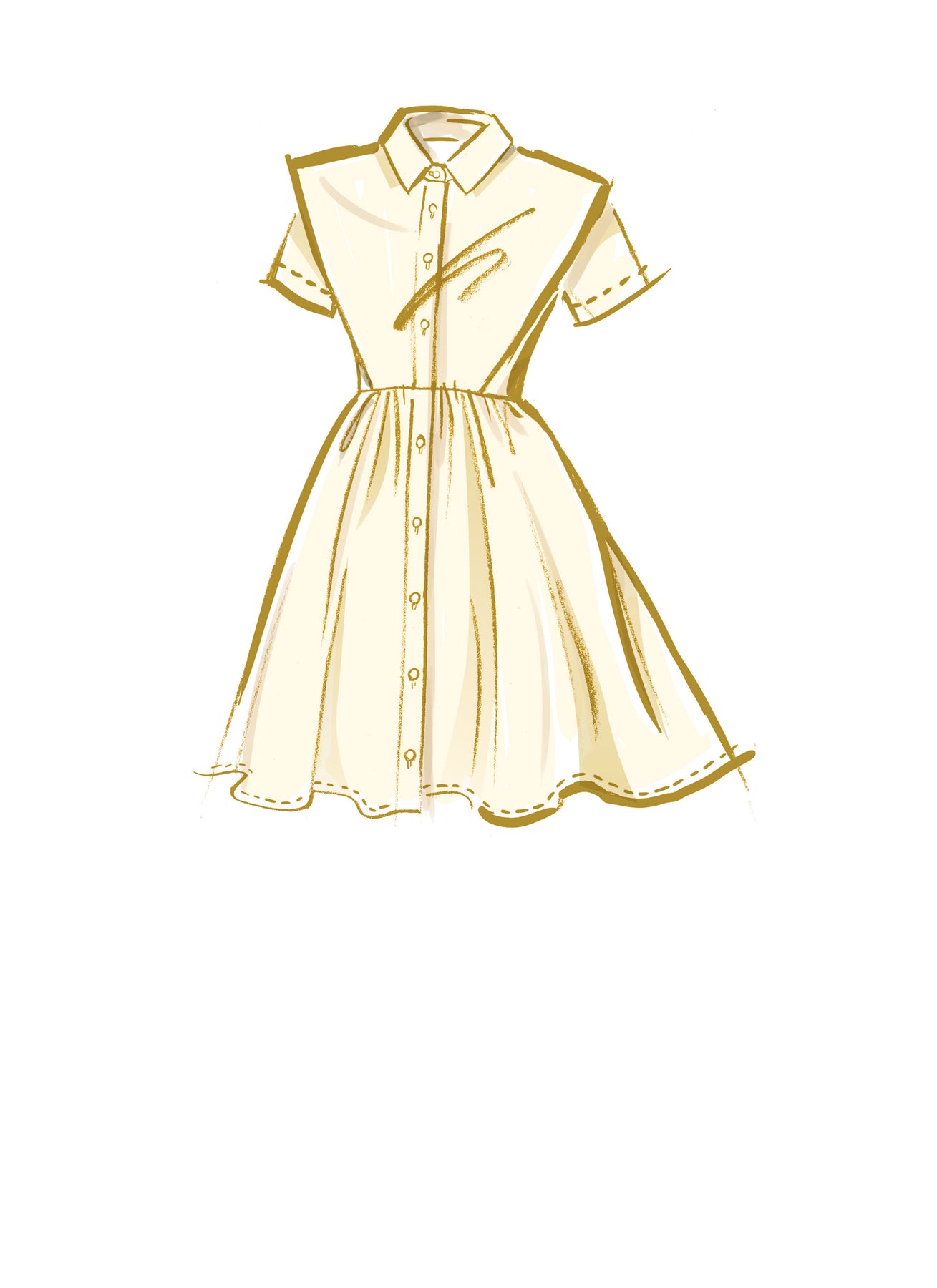 Das Kleid mit Button-Down-Kragen hat verschiedene Längen und Ärmel. Ansicht B ist ärmellos mit Schrägband am Armausschnitt. Ansicht C hat lange Ärmel mit Manschetten.