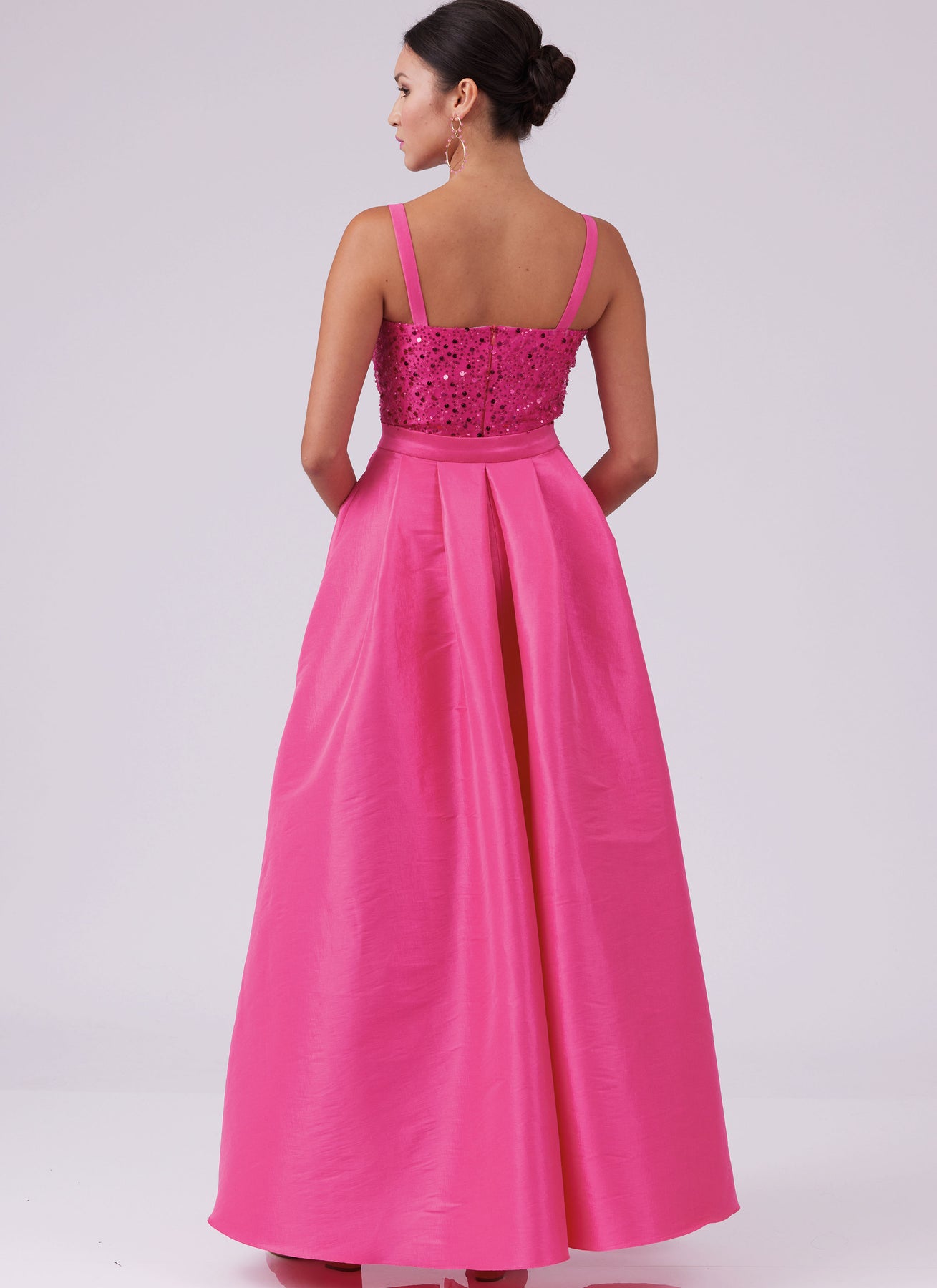 Das Kleid oder der Jumpsuit für besondere Anlässe kann mit einem abnehmbaren Überrock getragen werden, der optional eine Schleppe hat. Separate Schnittmuster für die Körbchengrößen A/B, C, D für Damen und C, D und DD für Damen.
