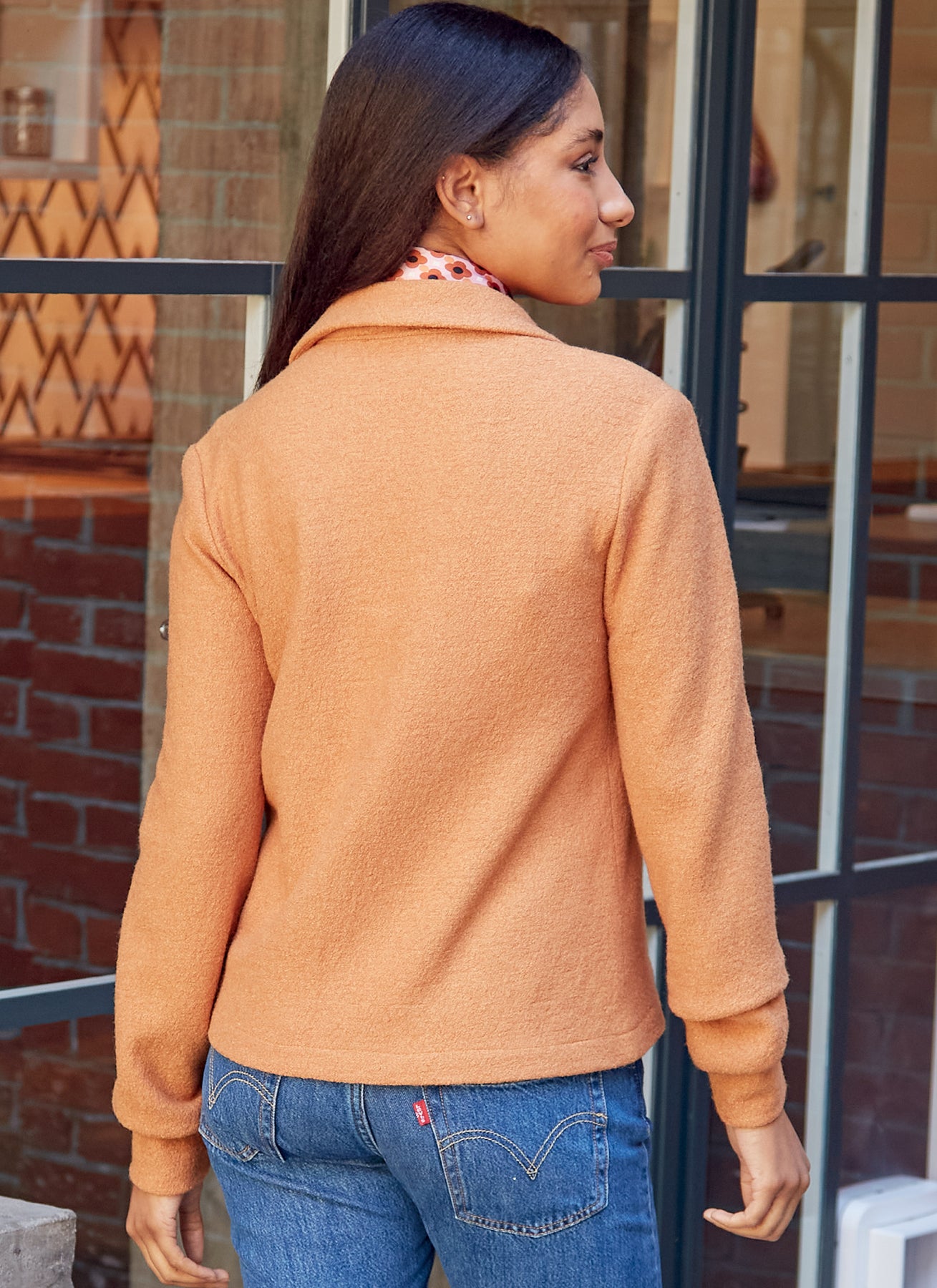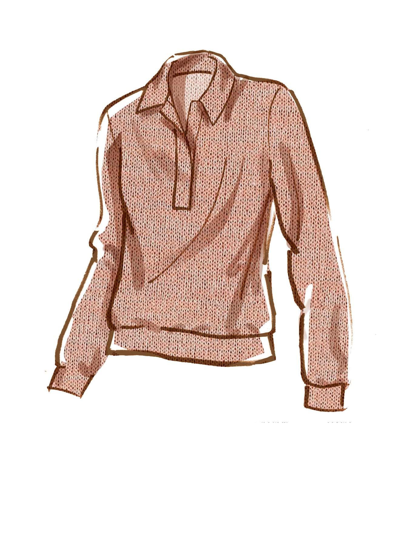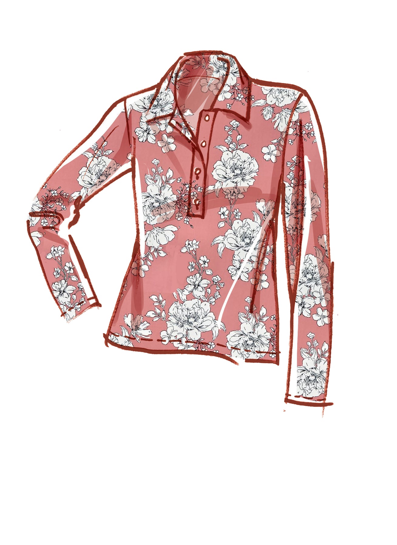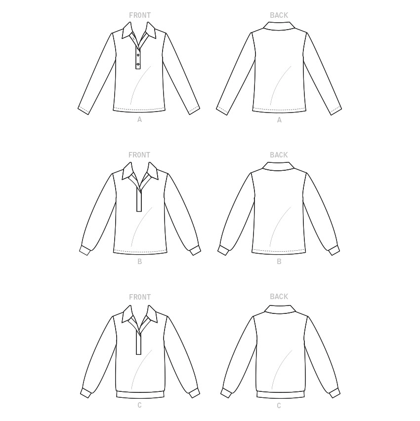 Polostrick-Pullover haben eine halbe Knopfleiste mit Kragen und lange Ärmel. Dieses Schnittmuster enthält Ansichtsoptionen für gebündelte Säume, genähte Säume, offene Knopfleiste und geknöpfte Knopfleiste.