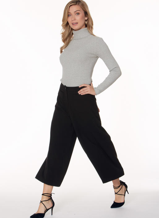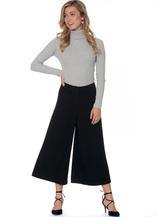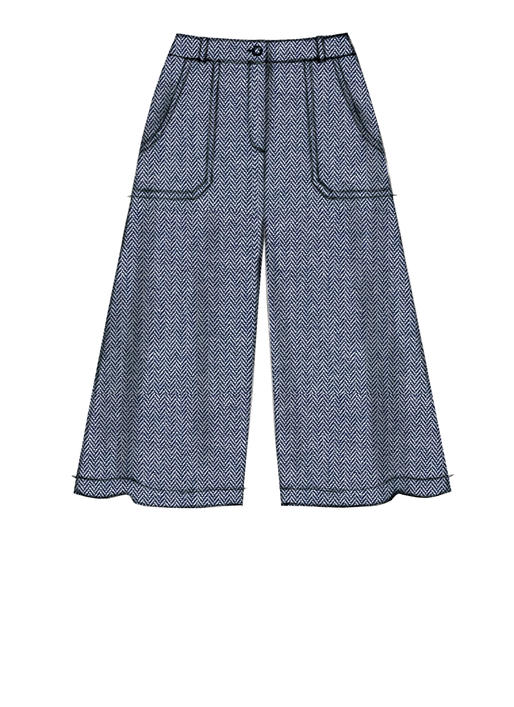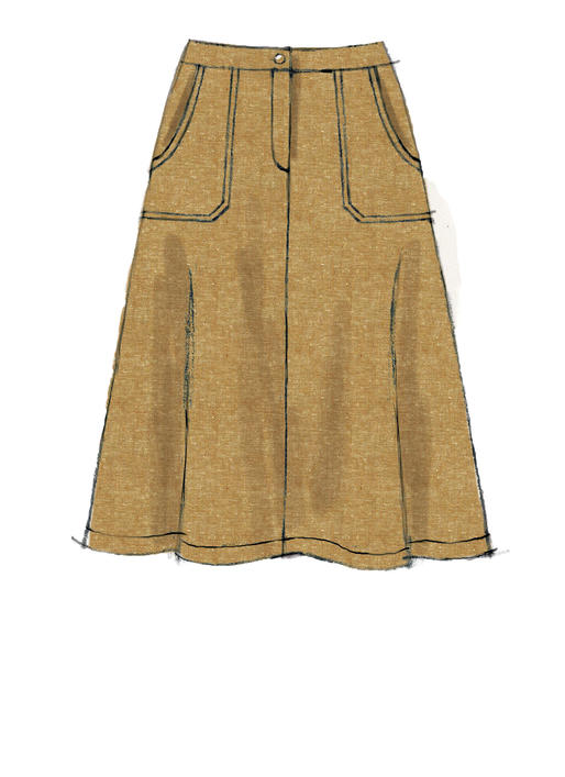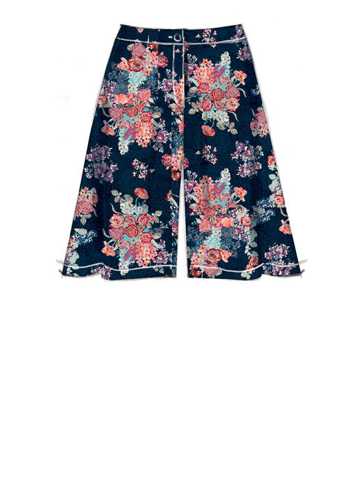 Halbtaillierte Röcke, Shorts und Culottes mit Mock-Fly vorne, Rückenpasse und Längenvariationen. A, C, E: Taillenband, Träger. A, B, E, F: Aufgesetzte Taschen vorne. A, C, D, E: Aufgesetzte Gesäßtaschen.
