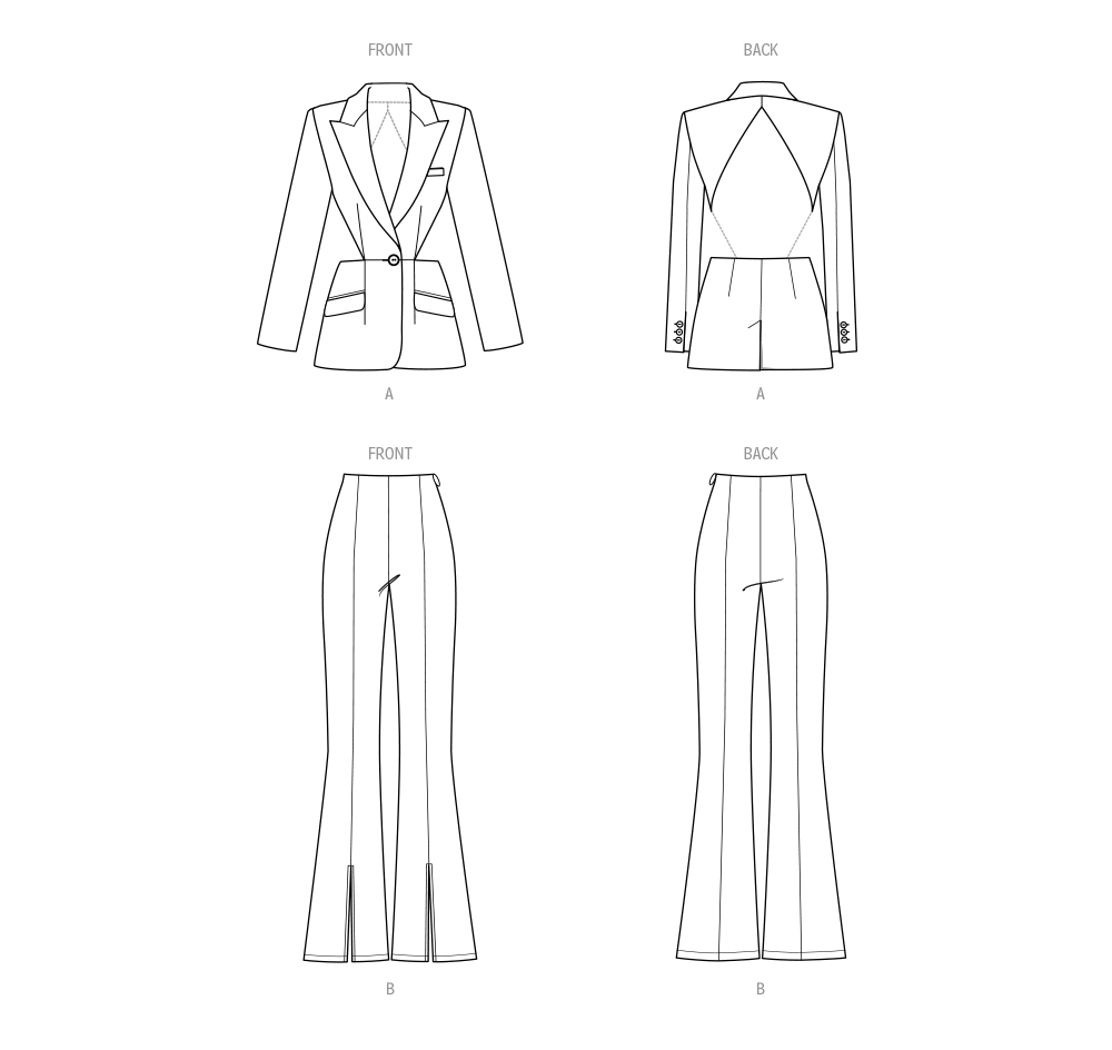 Moderner, gefütterter Blazer mit Rückenausschnitt, Spitzrevers, tiefem V-Ausschnitt, Pattentaschen in der Taille, Ärmeln mit Knopfmanschetten und Rückenschlitz. Die taillierte Hose hat Schlitze auf der Vorderseite und einen unsichtbaren Seitenreißverschluss.