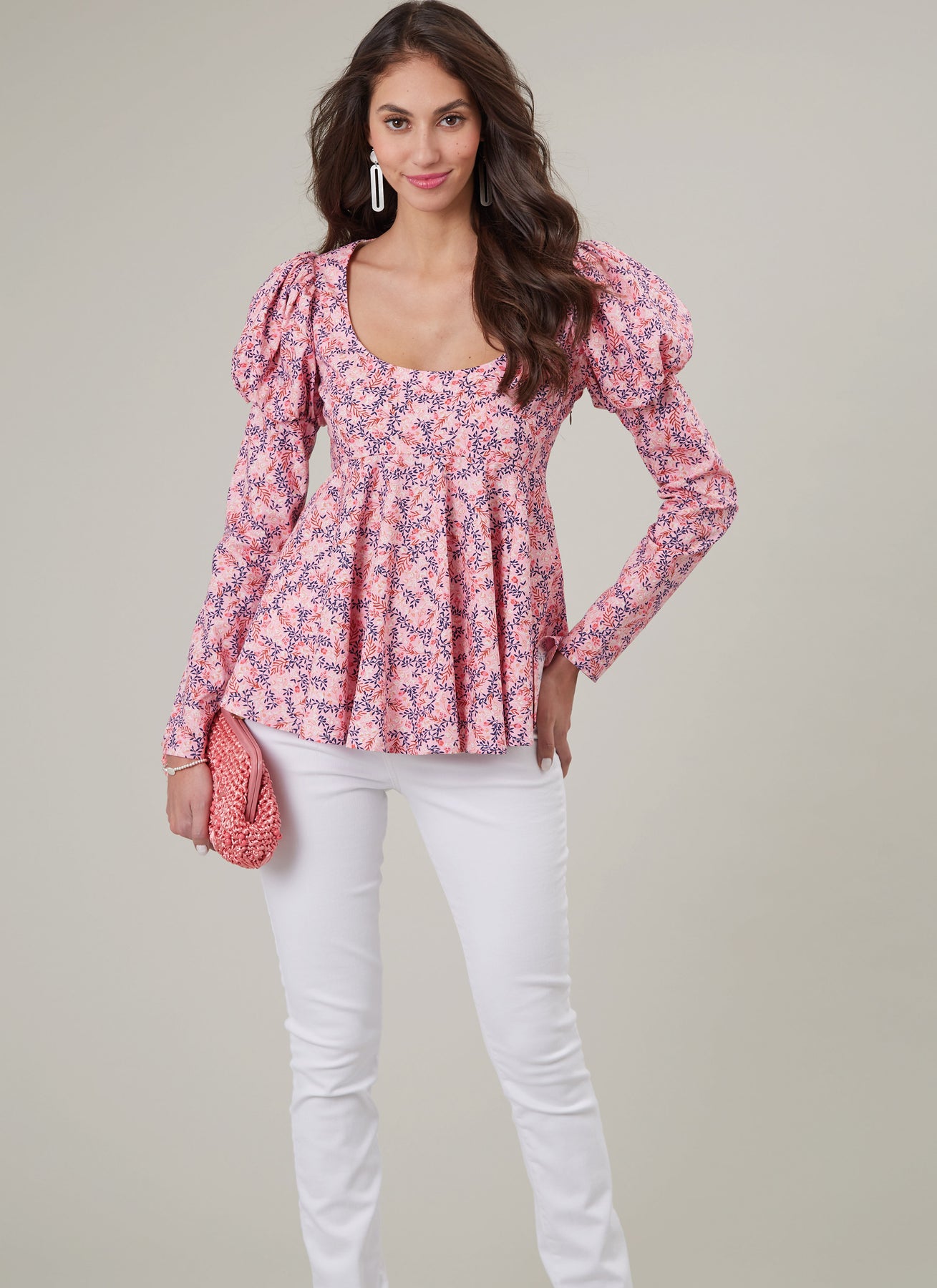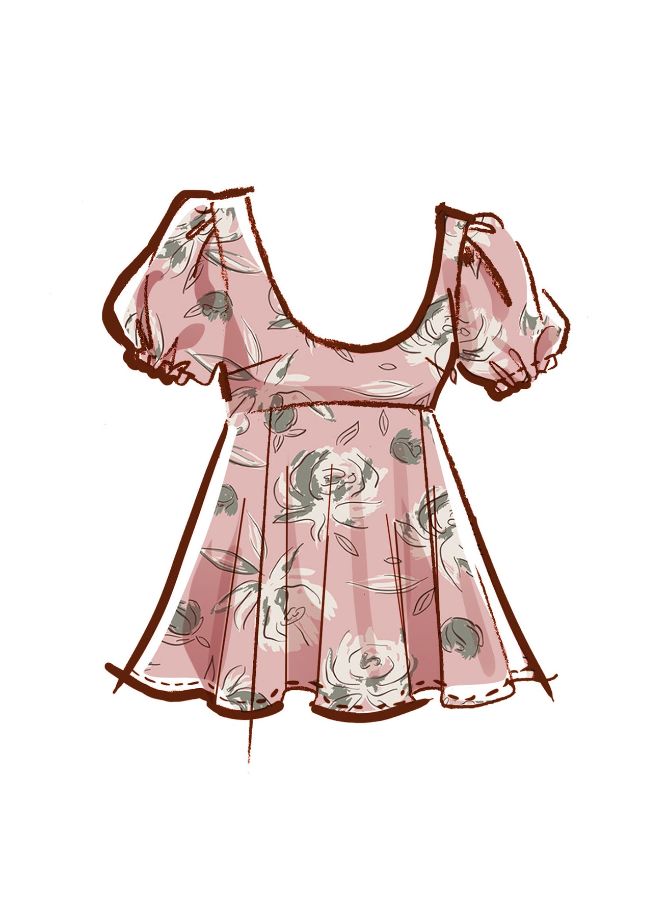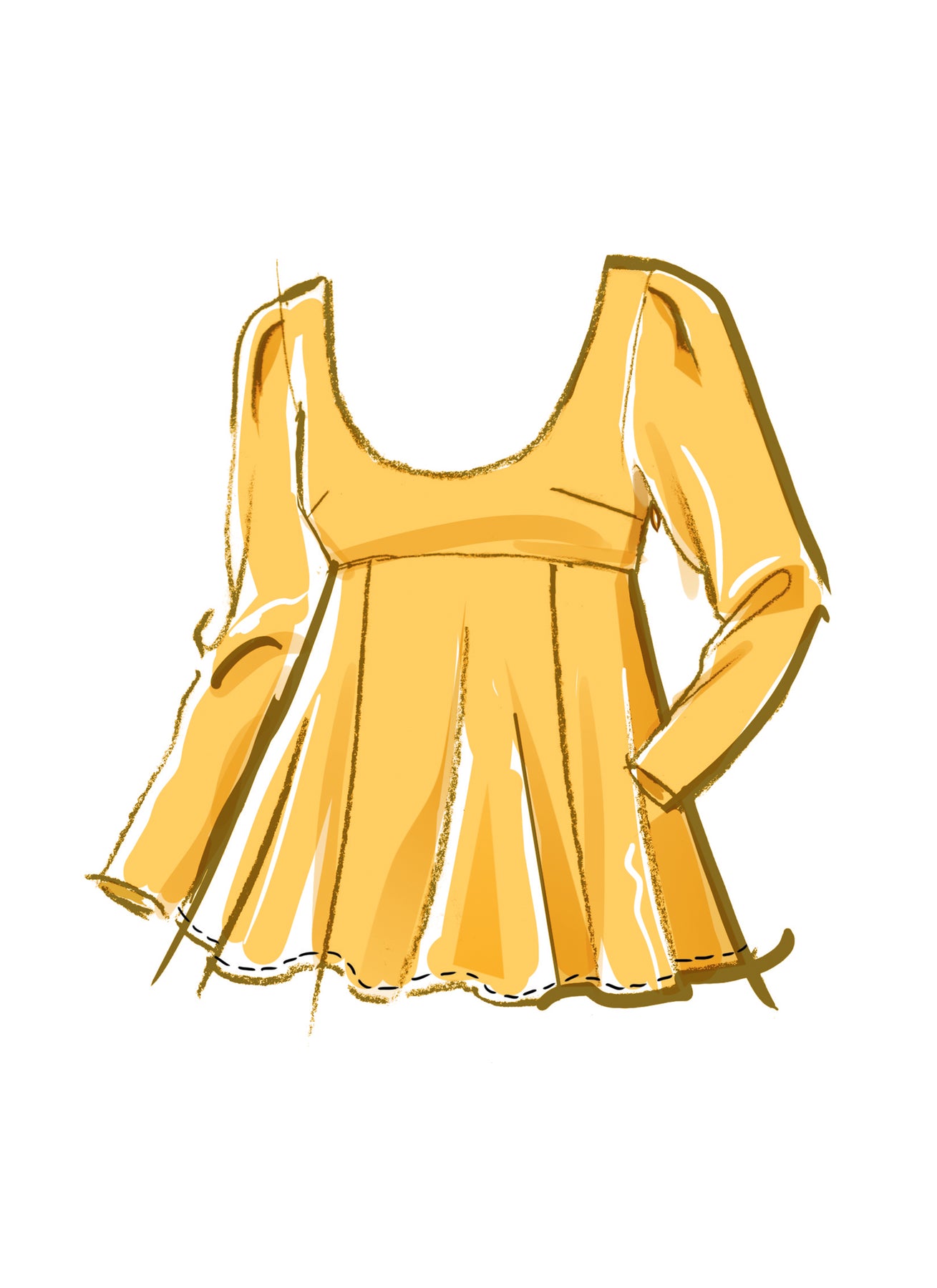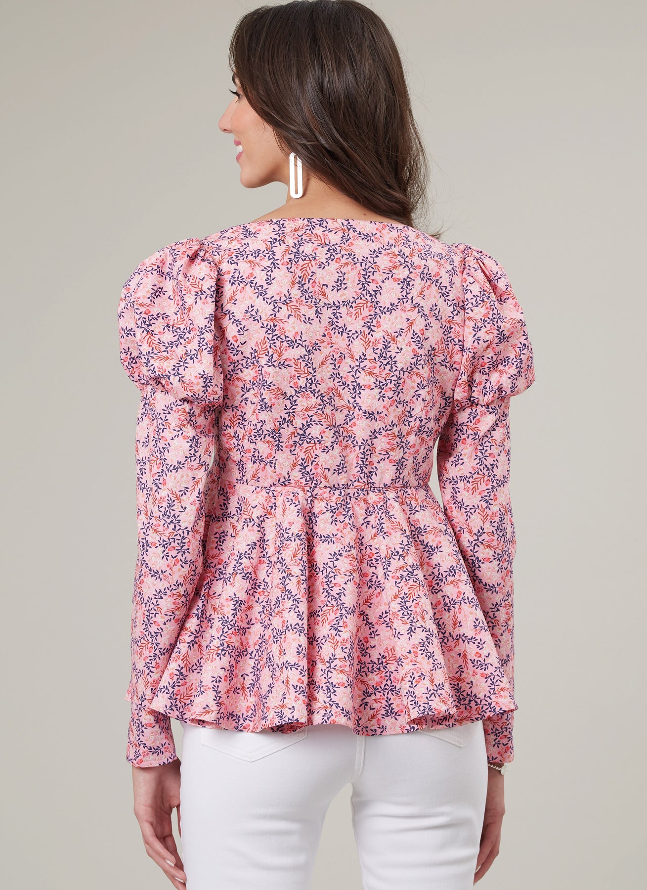 Oberteile mit Passform und Ausschnitt haben einen Rundhalsausschnitt, Brustabnäher, geraffte Puffärmel, Juliette-Ärmel und lange Ärmel. Separate Schnittmusterteile für die Körbchengrößen A/B, C, D.