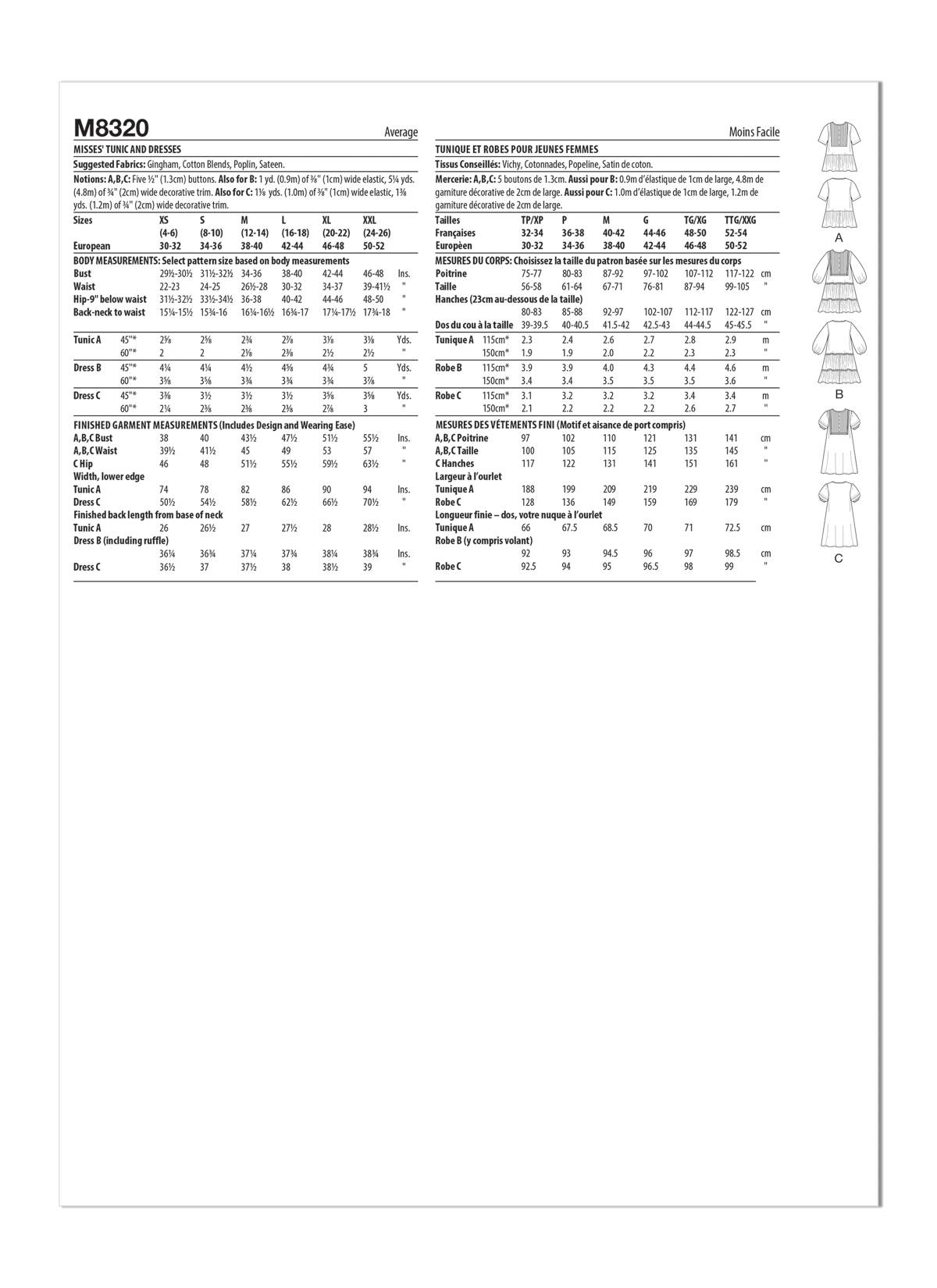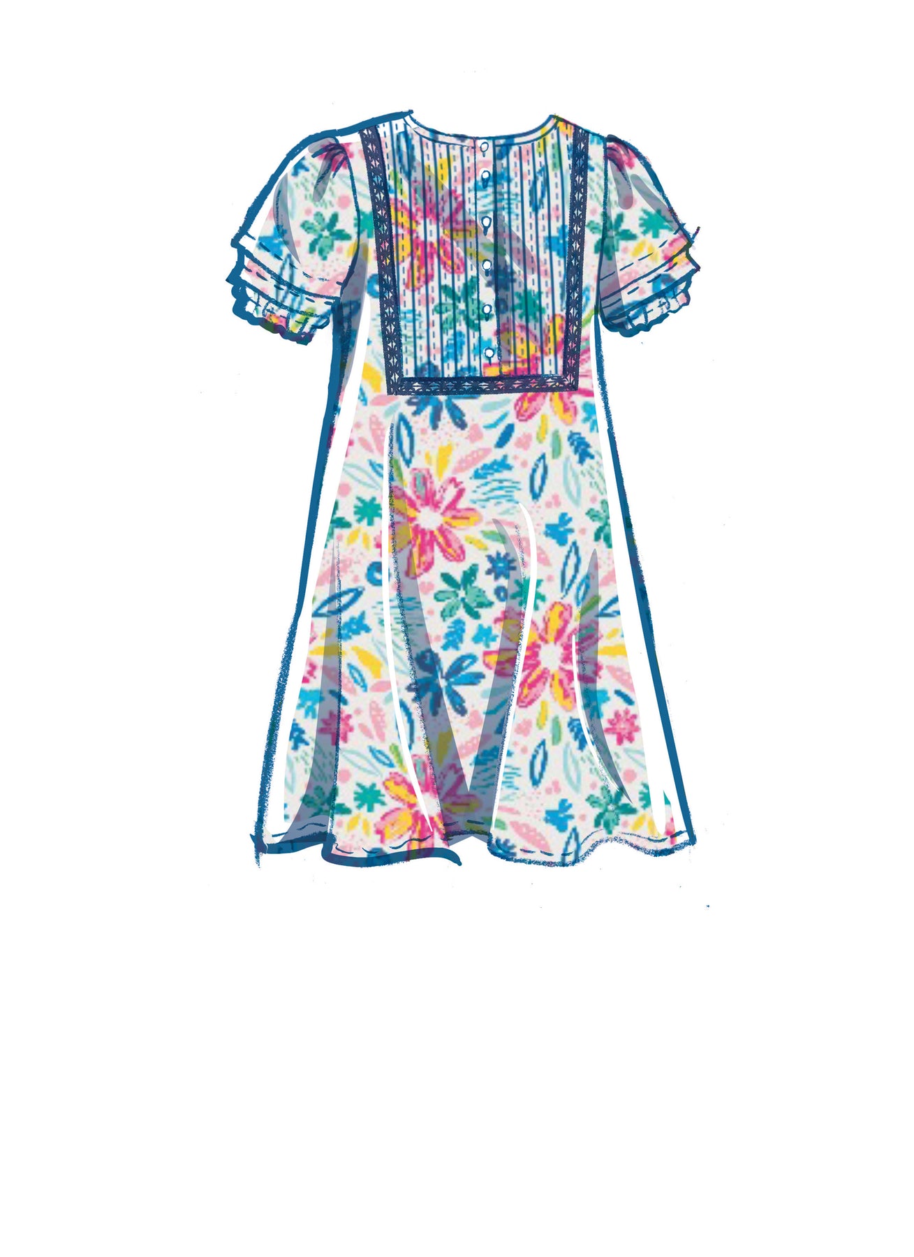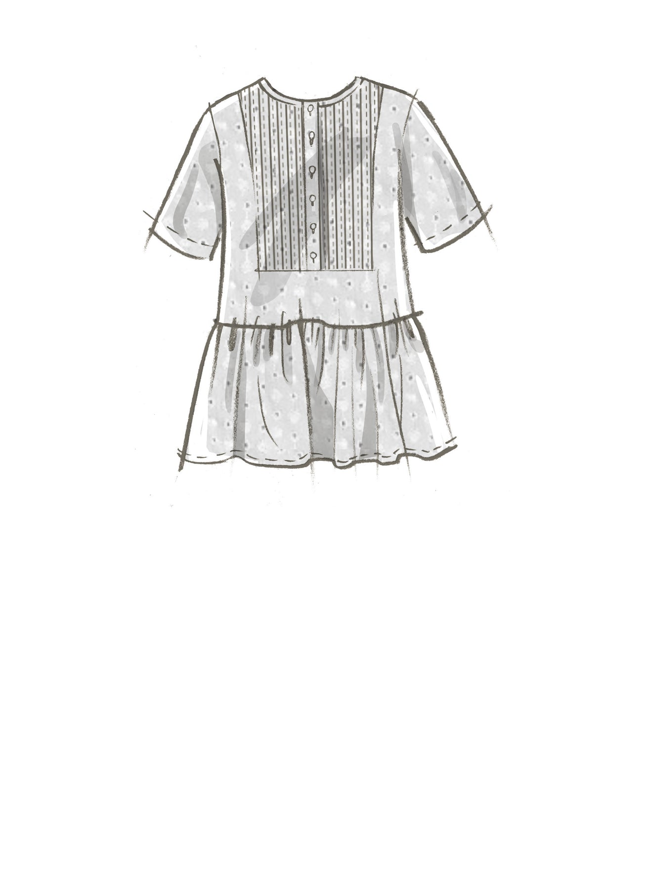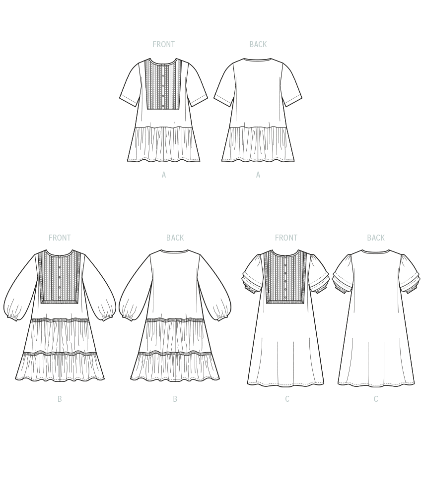 Pullover mit Knopfleiste, Tunika und Kleider mit Biesen sind in zwei Längen erhältlich. Es gibt kurze Ärmel, Puffärmel mit Biesen und Dreiviertelärmel mit elastischem Saum. Die Tunika hat unten eine geraffte Rüsche. Ansicht B ist gestuft und hat eine Zierborte. Ansicht C ist oberhalb des Knies und hat eine Zierborte.