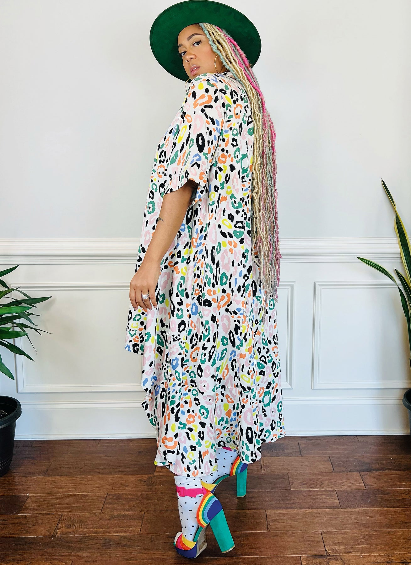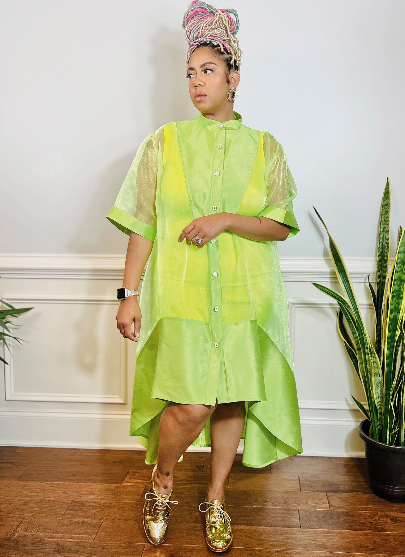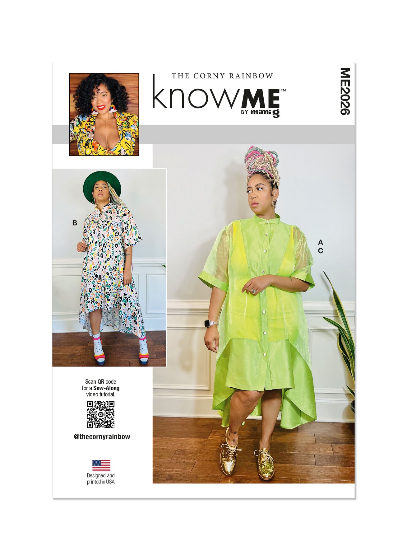 Übergroßes Kleid mit durchsichtiger Knopfleiste und französischen Nähten hat einen hochgeschlossenen Saum und optionalen Kontrast wie abgebildet. Das transparente Hemdblusenkleid wird über dem schmal geschnittenen, ärmellosen Strickkleid getragen.
