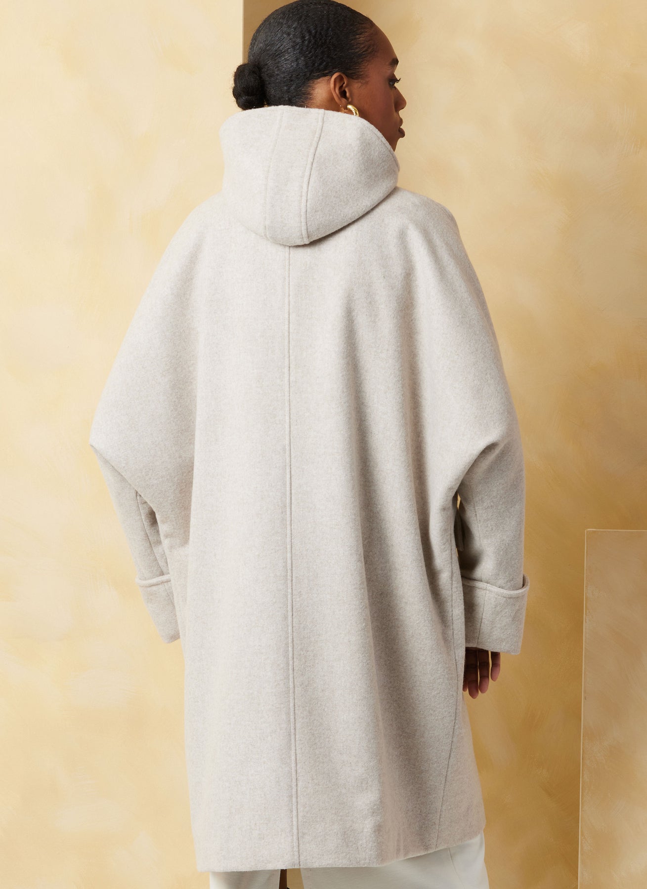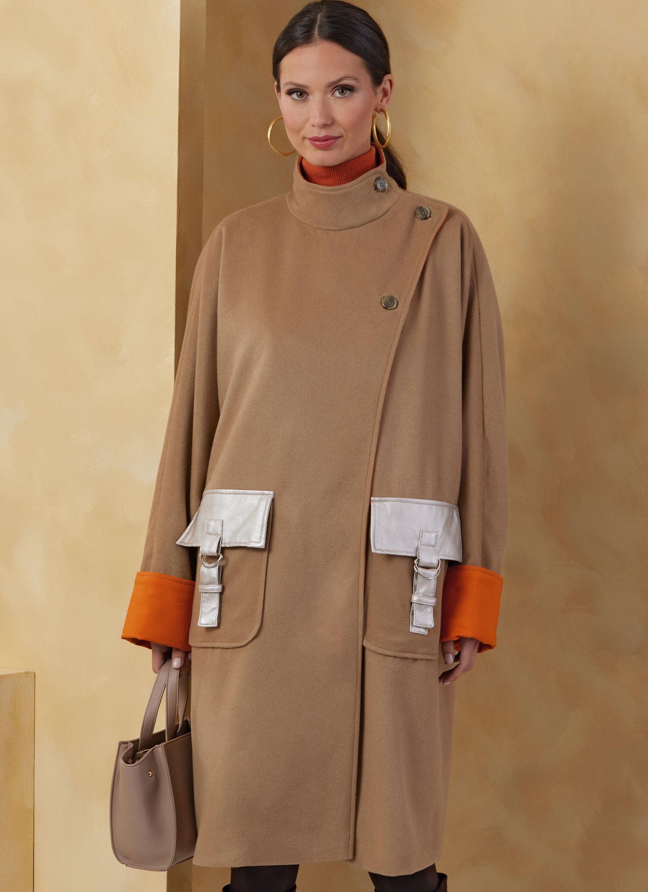 Sehr locker sitzender Mantel mit langen Dolman-Ärmeln, gebundenen Knopflöchern und Vordertaschen. Ansicht A hat einen Stehkragen, kontrastfarbene Manschetten und Taschenklappen. Ansicht B hat eine selbstgefütterte Kapuze.