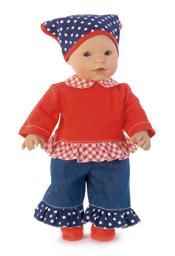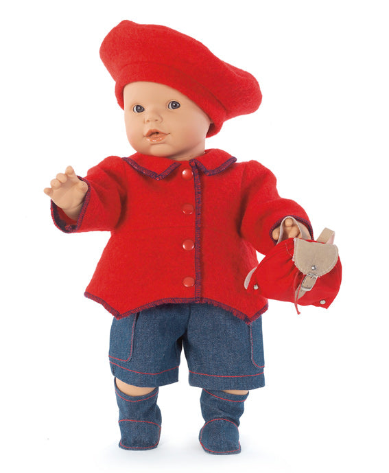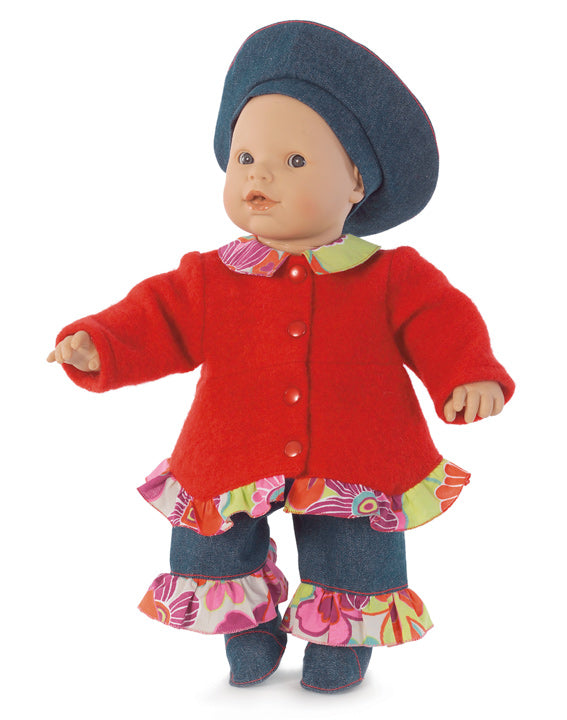 Sieben Kleidungsstücke, dazu noch Mütze, Kopftuch und Stiefel. So kann die Puppenmutti immer neu kombinieren. Eine Garderobe die keine Wünsche offen lässt.