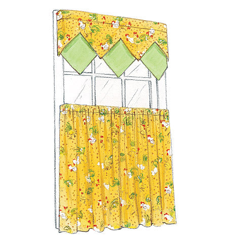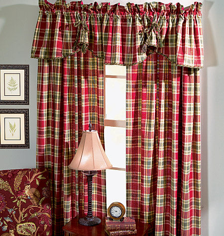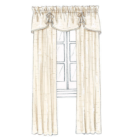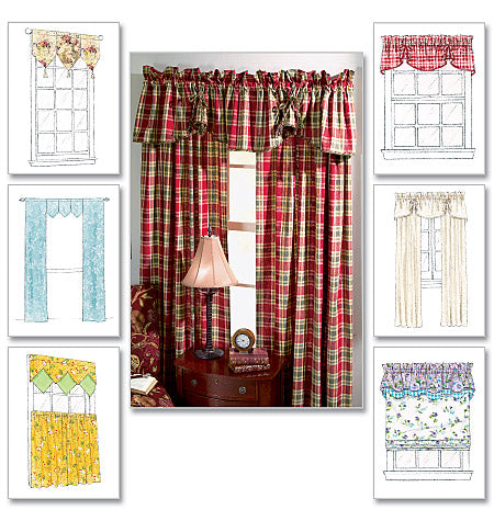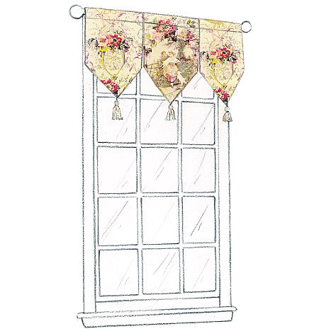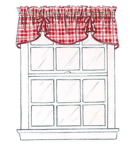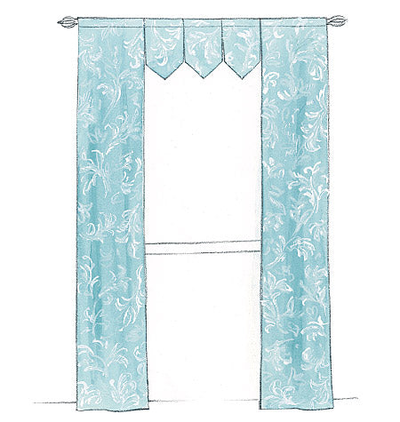 Das Paket enthält Anleitungen und einige Muster für sechs Fensterbehänge, die für Fenster mit einer Breite von 92 cm, 122 cm und 152 cm geeignet sind. Volant A: Einzelne Paneele mit den Maßen 31 cm x 38 cm (12" x 15"). Fensterdekoration B: Umfasst Volant A und gefütterte Seitenteile mit einer Breite von 46 cm (18") und der von Ihnen gemessenen Länge. Fensterdekoration C: Volant und Cafe-Vorhänge. Volant D. Fensterdekoration E: Umfasst Volant D und Vorhänge. C, D, E: Volant 31 cm (15") tief. C, E: Jedes ungefütterte Vorhangpaneel misst die Breite des Stoffes in der von Ihnen gemessenen Länge. Die Fülle der Vorhänge kann je nach Stoffbreite variieren. Window Treatment F: Volant, 15" tief, und Raffrollo. Alle Volants sind gefüttert.