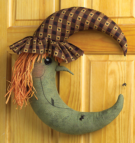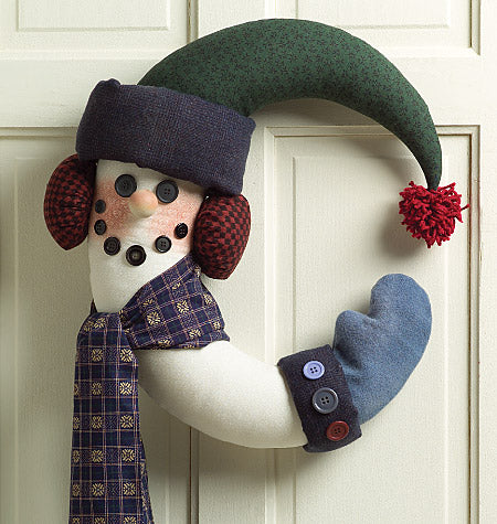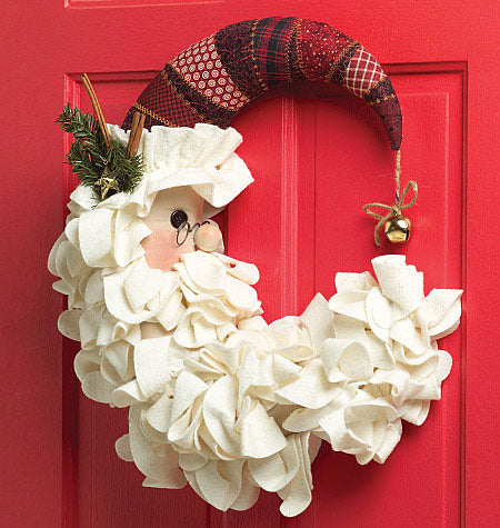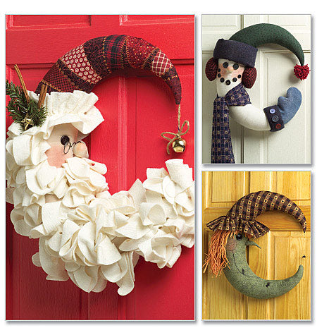 Weihnachtsdekoration in 3 Variationen. Das Paket enthält Vorlagen und Anleitungen für drei Dekorationen für Tür oder Wand, jede mit einem Durchmesser von ca. 20". Weihnachtsmann A: Kontrastierender Bart, Mützenband und geflickte Mütze. Schneemann B: Mütze, Schal, Bänder, Fäustlinge und Ohrenschützer in Kontrastfarbe. Hexe C: Hut und Krempe in Kontrastfarbe.