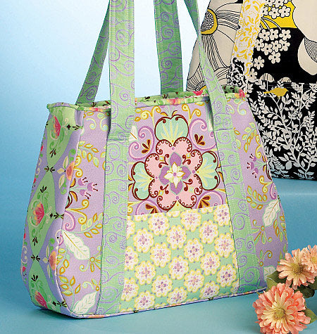 Trendige Tasche in drei Größen. Das Paket enthält Schnittmuster und Anleitungen für Taschen in drei Größen: Klein (12" x 8½"), mittel (14" x 10½"), groß (16½" x 13½"). Alle Taschen haben kontrastierende Abschnitte, Innentaschen und Futter. Die Maße sind ungefähre Angaben und verstehen sich ohne Griffe.