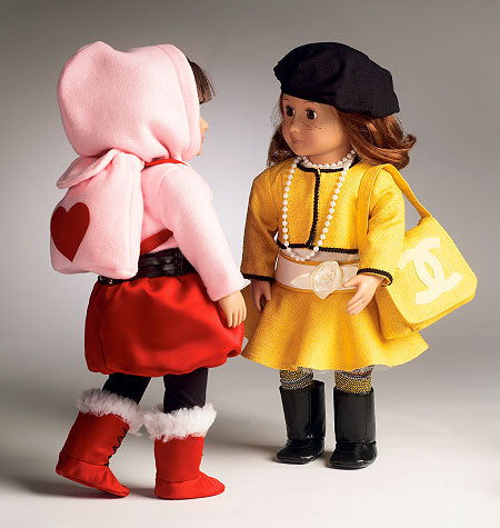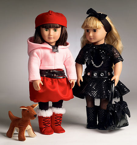 BEKLEIDUNG FÜR 18"-PUPPE, ZUBEHÖR UND HUND: Drei Outfits: Alle Outfits bestehen aus Oberteil, Leggings, Rock, Gürtel, Stiefeln und Halsband. A: Jacke, Hut und Tasche mit Kontrastapplikation. B: Stirnband und Tasche mit kontrastierender Schleife. C: Jacke mit Kapuze, Hut und Rucksack mit Kontrastapplikation. Hund D: 5 "B. x 6 "L.; Innenohr und Bauch/Beine in Kontrastfarbe. Hinweis: Die Proportionen der Puppen können je nach Hersteller abweichen. Für eine bessere Passform können Anpassungen einzelner Teile während der Konstruktion erforderlich sein.
