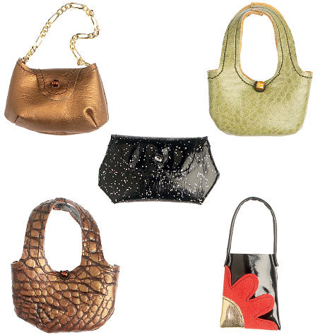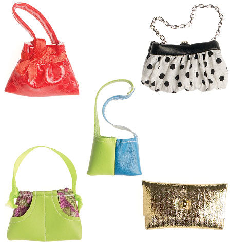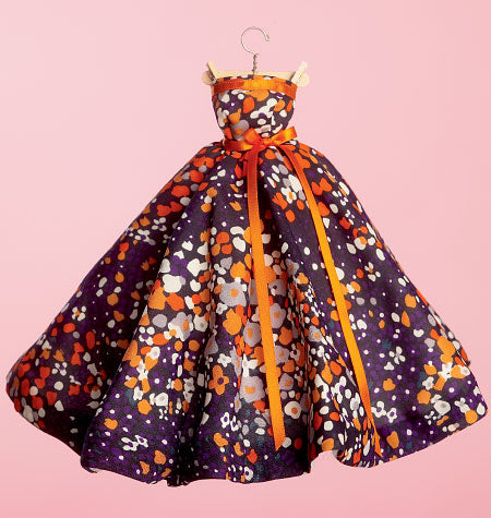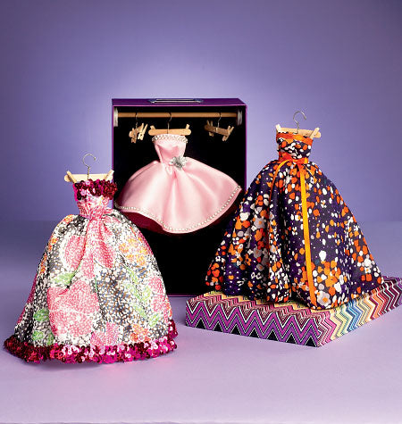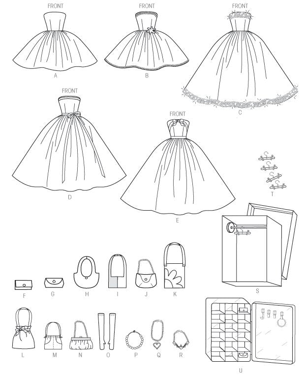 111/2" MODEPUPPENKLEIDUNG, ZUBEHÖR, KLEIDERBOX, ZUBEHÖRBOX: Kleid A: Selbstgefüttertes Oberteil und kontrastierender Rocküberzug. Kleid B: Selbstgefüttertes Oberteil. Kleid C,D,E: Gefüttert. Taschen F,G,H,I,J. Tasche K: Blumenapplikation in Kontrastfarbe. Tasche L. Tasche M: Kontrastfarbene Vorder- und Rückentaschen und gekauftes Band. Tasche N: Kontrastfarbiges Band. Handschuhe O. Halsketten P,Q,R. Kleiderbox S. Kleiderbügel T: Ein Kleiderbügel. Accessoire-Box U.