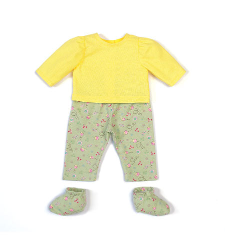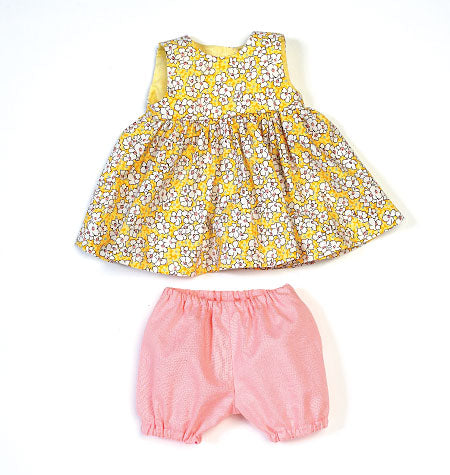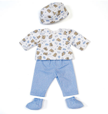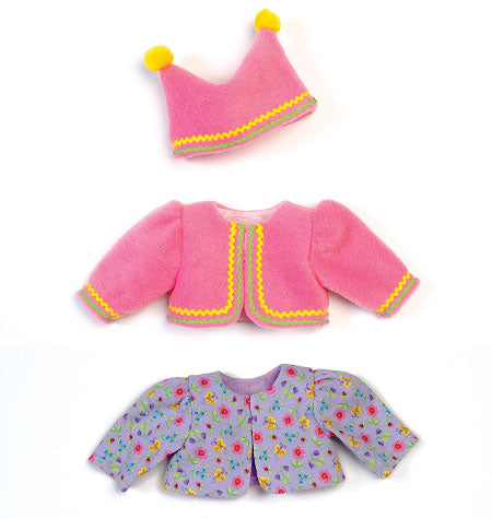 KLEIDER UND ZUBEHÖR FÜR 11" - 12" und 15" - 16" BABY DOLLS: Kleider A, B: Gefüttertes Oberteil. B: Rock mit kontrastierendem Überzug. Höschen C. Jacke D: Gefüttert, optionaler Saum. Oberteil E: Optionale Herzapplikation in Kontrastfarbe. Oberteil F: Rock in Kontrastfarbe. Hose G. Füßlinge H. Stirnband I: Gekaufte Blume oder Bandschleife. Mütze J: Gekaufte Bommeln. Mütze K. HINWEIS: Die Proportionen für Puppen können je nach Hersteller variieren. Für eine bessere Passform kann es notwendig sein, die einzelnen Teile während des Baus anzupassen.