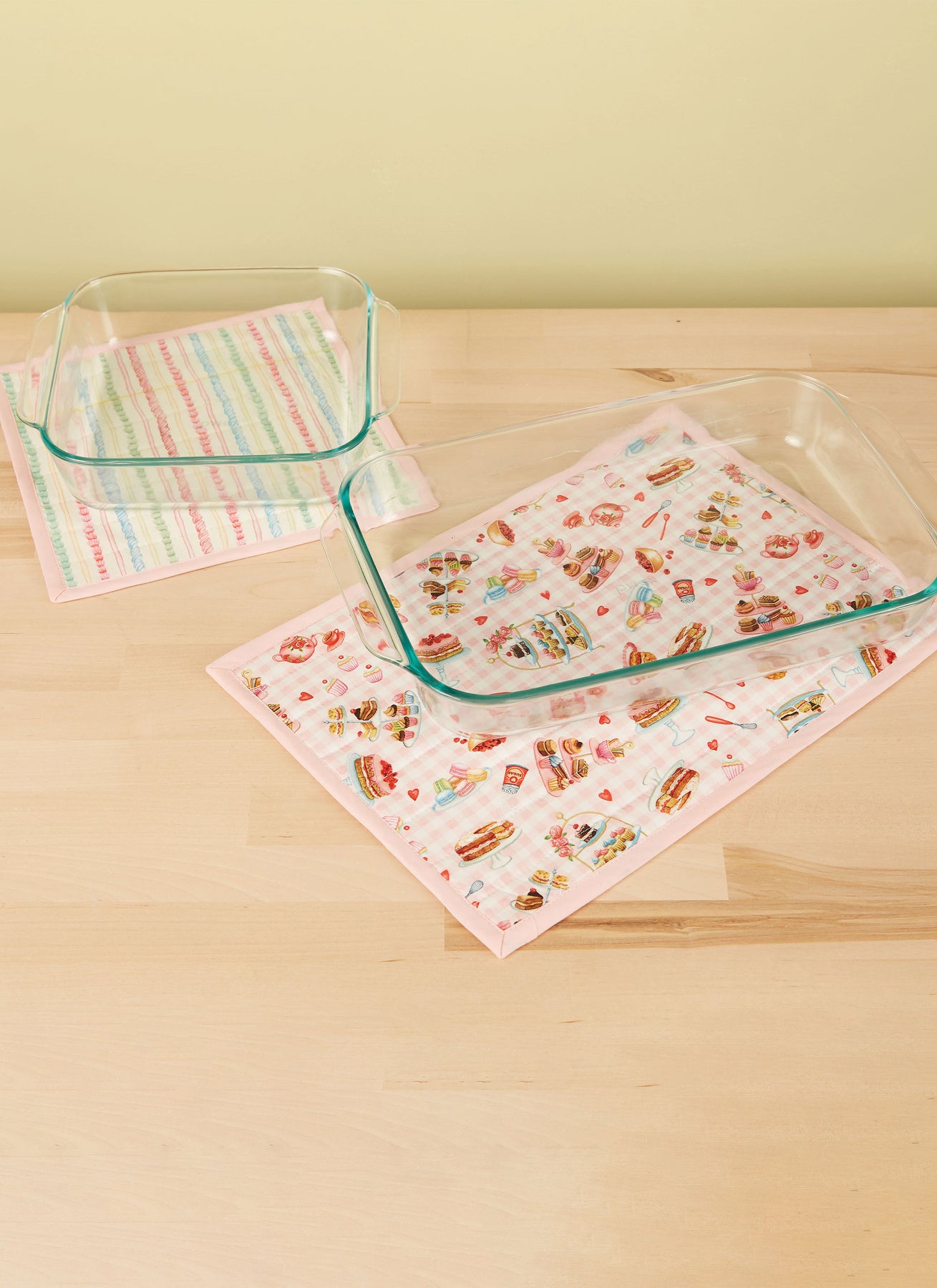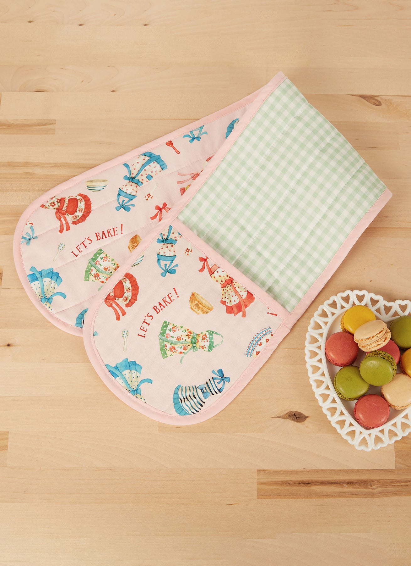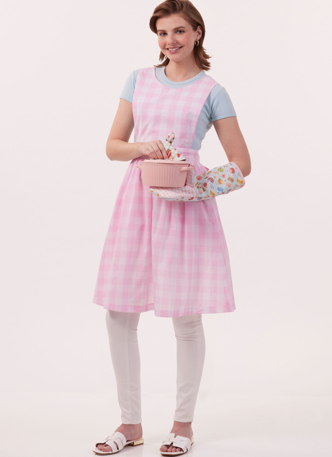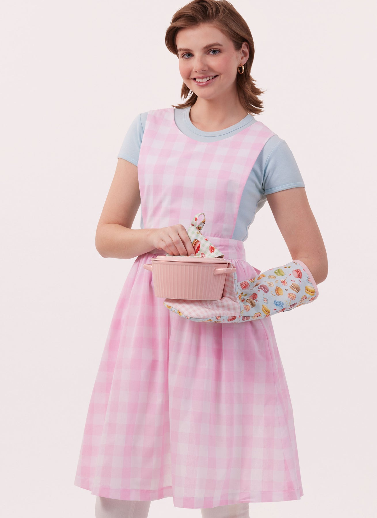 Die zarte Schürze hat Seitennahttaschen und wird mit einer Schleife auf dem Rücken gebunden. Heizkissen in zwei Größen und Topflappen haben eine hitzebeständige Isolierwatte.