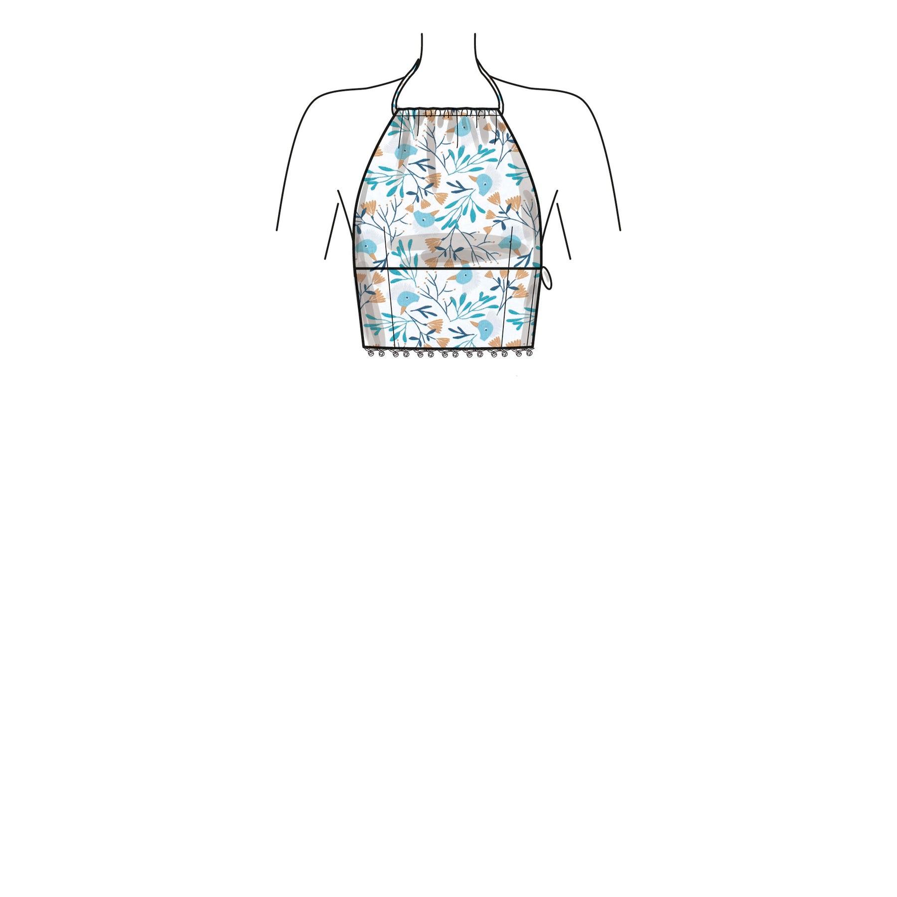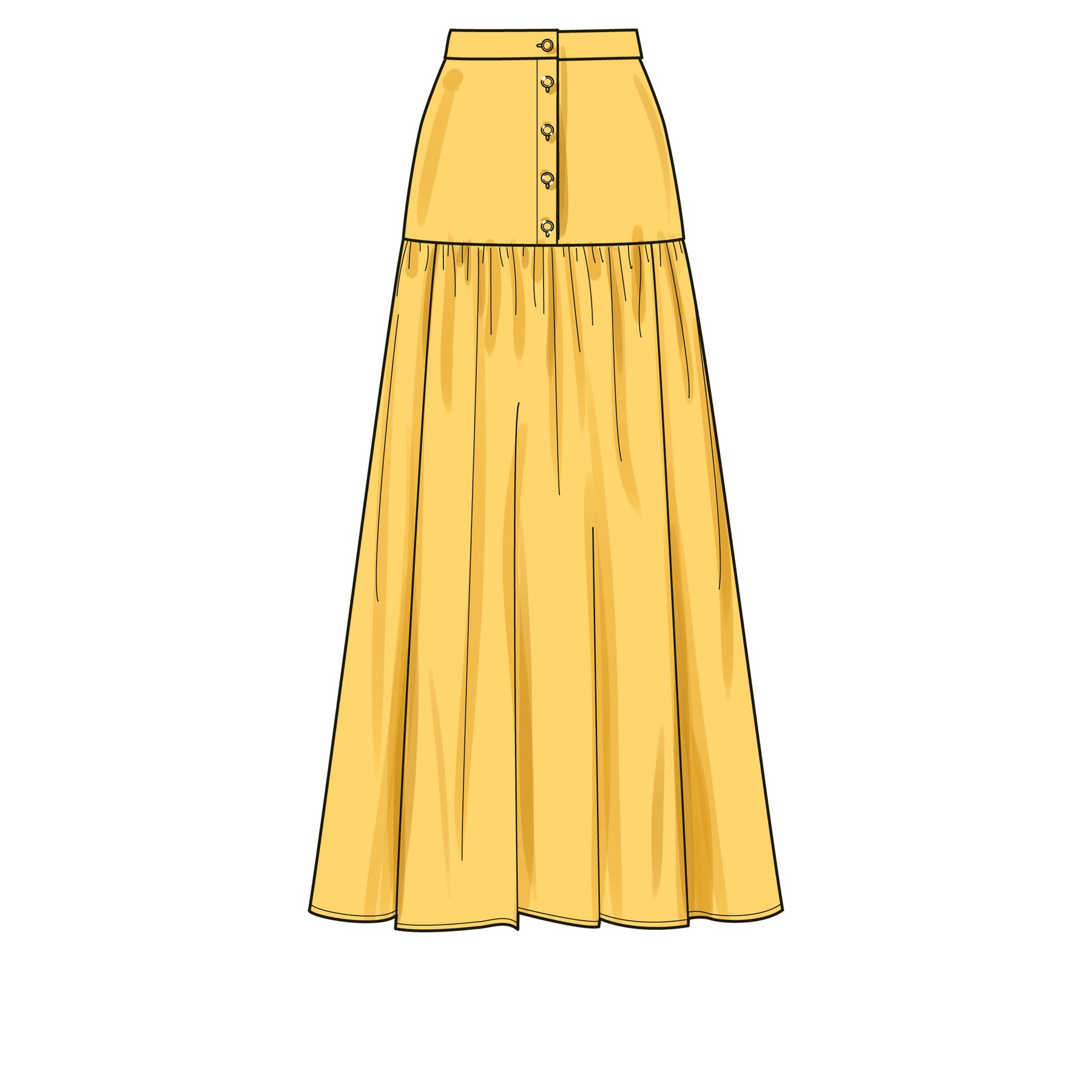Cropped Neckholder-Oberteil mit Brust- und Taillenabnähern und Seitennaht-Reißverschluss mit der Möglichkeit, den Rücken niedrig oder hoch zu tragen. Der gestufte, taillierte Rock in zwei Längen hat funktionierende Knöpfe auf der Vorderseite, weiche Raffungen und verschiedene Besätze.