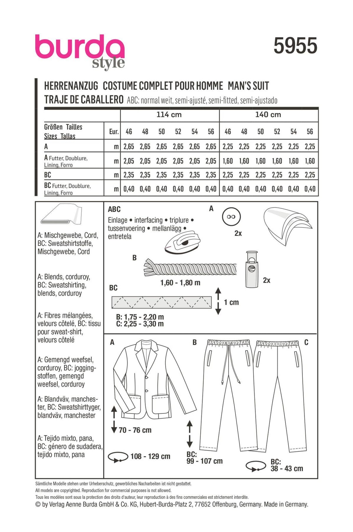 A: Mischgewebe, Cord. BC: Sweatshirtstoffe, Mischgewebe, Cord ABC: Aufbügelbare Einlage. A: 2 Knöpfe. 1 Paar Schulterpolster. B: 1,60 - 1,80 m Kordel. 2 Kordelstopper. BC: Gummiband, 1 cm breit, B: 1,75 - 2,20 m, C: 2,25 - 3,30 m.
