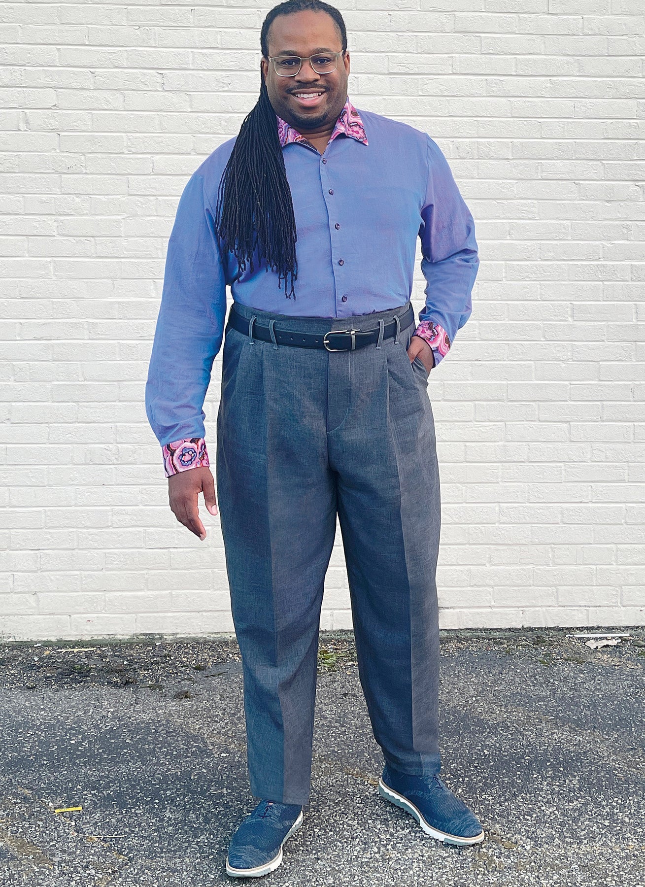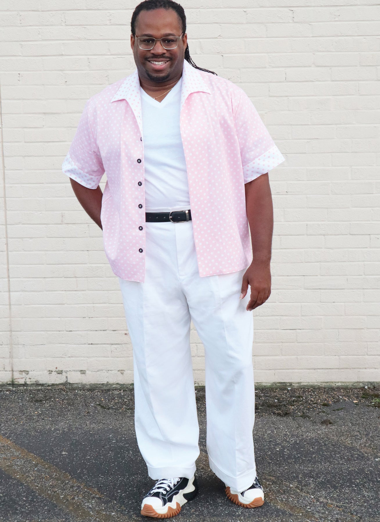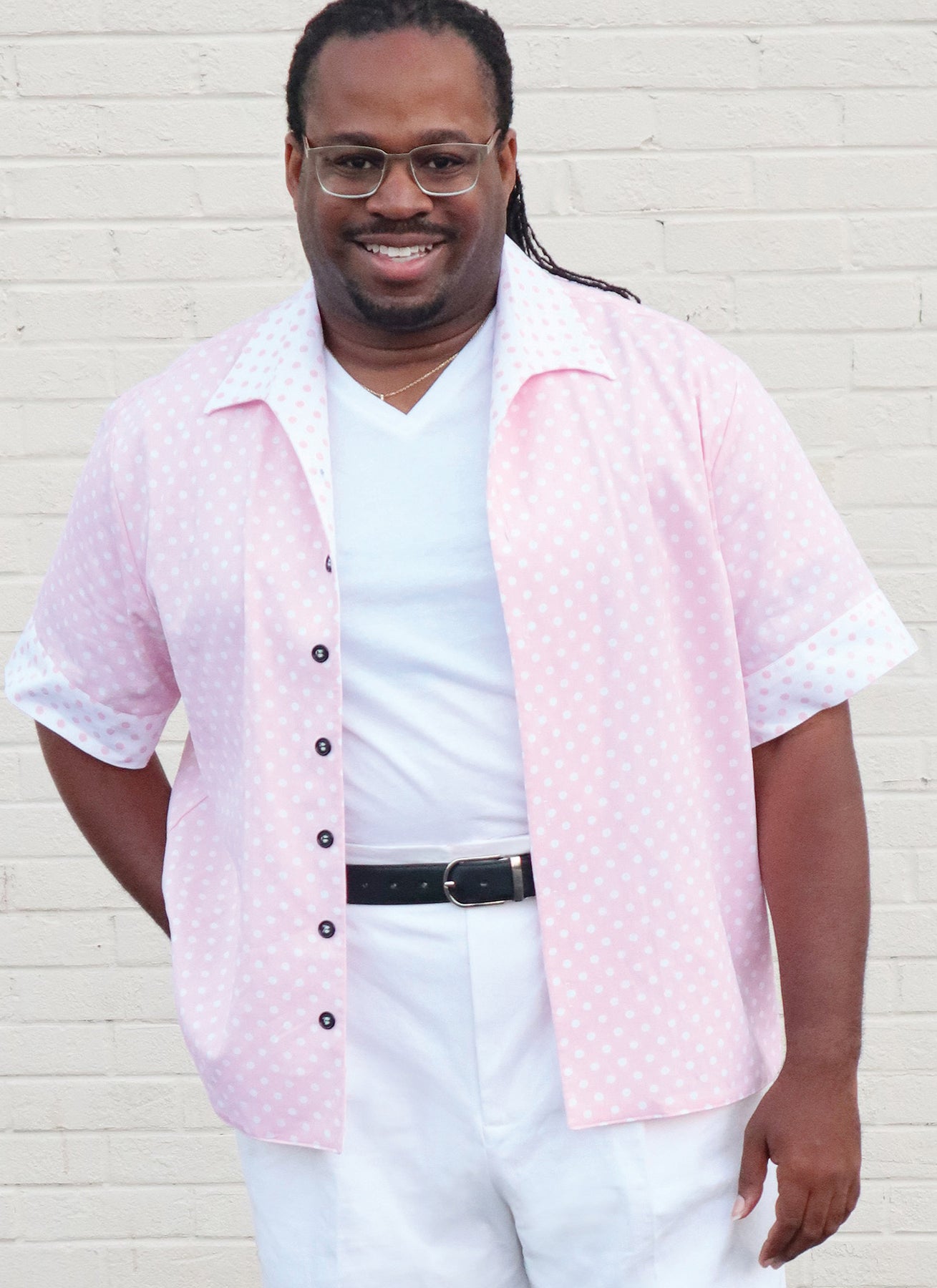 Herrenhemd zum Aufknöpfen mit italienischem Kontrastkragen und kurzen oder langen Ärmeln mit Kontrastmanschetten. Die Hose hat Stirnfalten, Schrägstrich-Taschen, einzelne Gesäßtaschen und Gürtelschlaufen. Wahlweise mit geradem oder weitem Bein mit Bündchen.