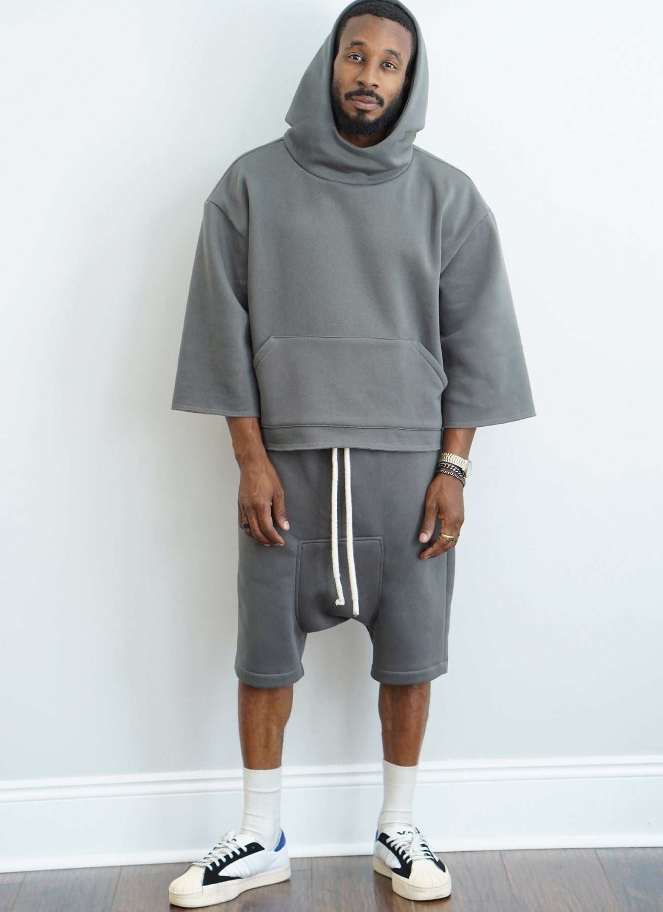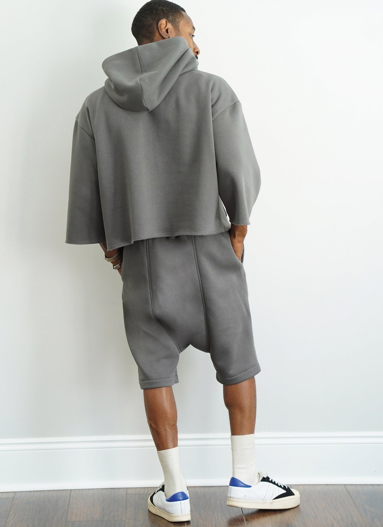 Der lässige, weit geschnittene Hoodie kommt wahlweise mit langen Ärmeln und Bündchen oder kurzen, ausgefransten Ärmeln. Die knielangen Shorts bieten einen elastischen Bund mit Kordelzug und praktische Seitentaschen – perfekt für einen entspannten, stylischen Look.