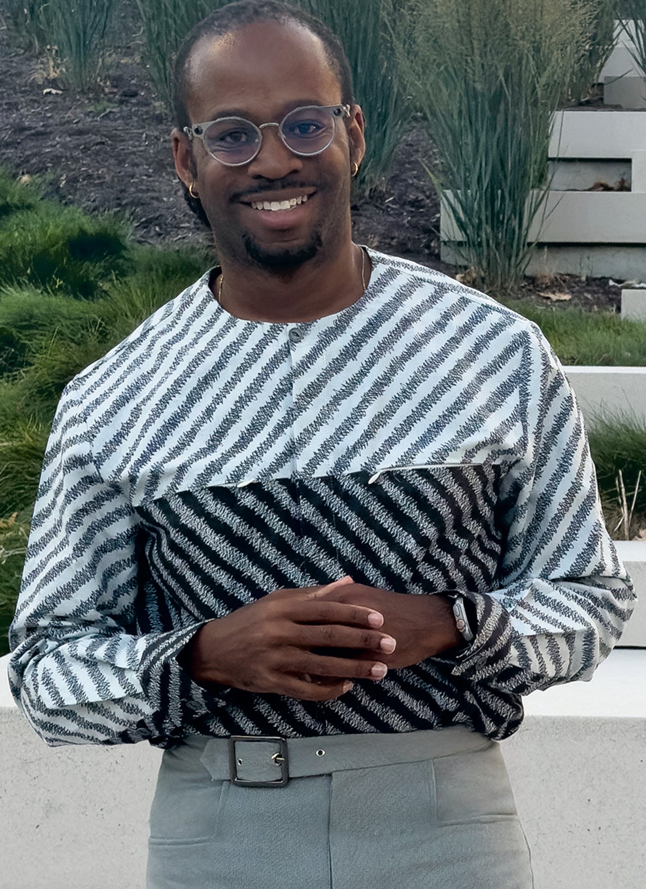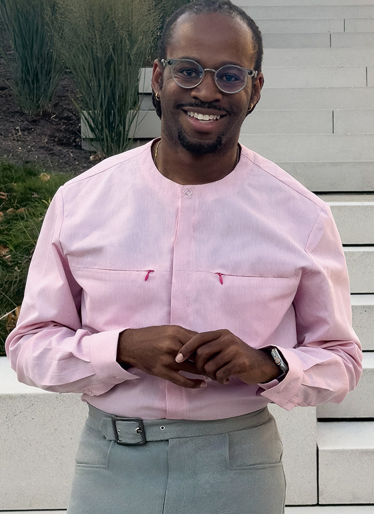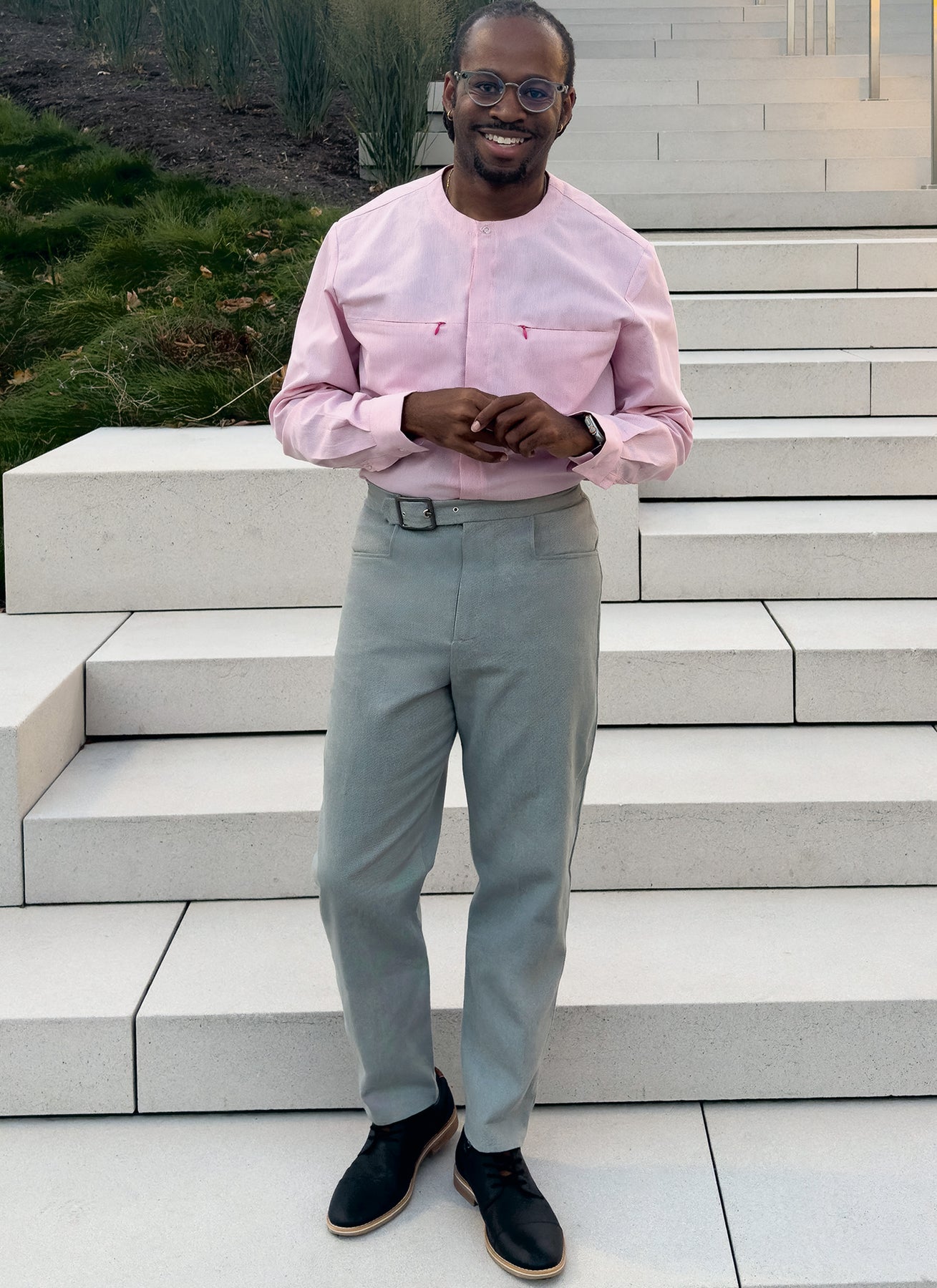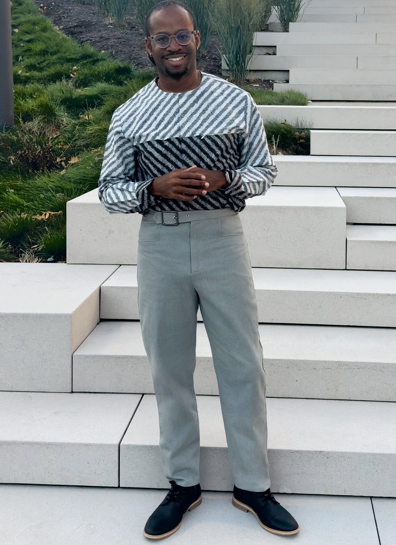 Kragenlose Hemden mit Knopfleiste vorne und hinten haben verdeckte Reißverschlusstaschen, Hemdzipfelsaum und lange Ärmel mit Knopfmanschetten. Ansicht B hat eine Kontrastpasse und Ärmel. Die Hose hat einen Bund mit integrierter Gürtelschnalle, einen Reißverschluss mit Haken und Riegel, Vordertaschen und einzelne Gesäßtaschen.