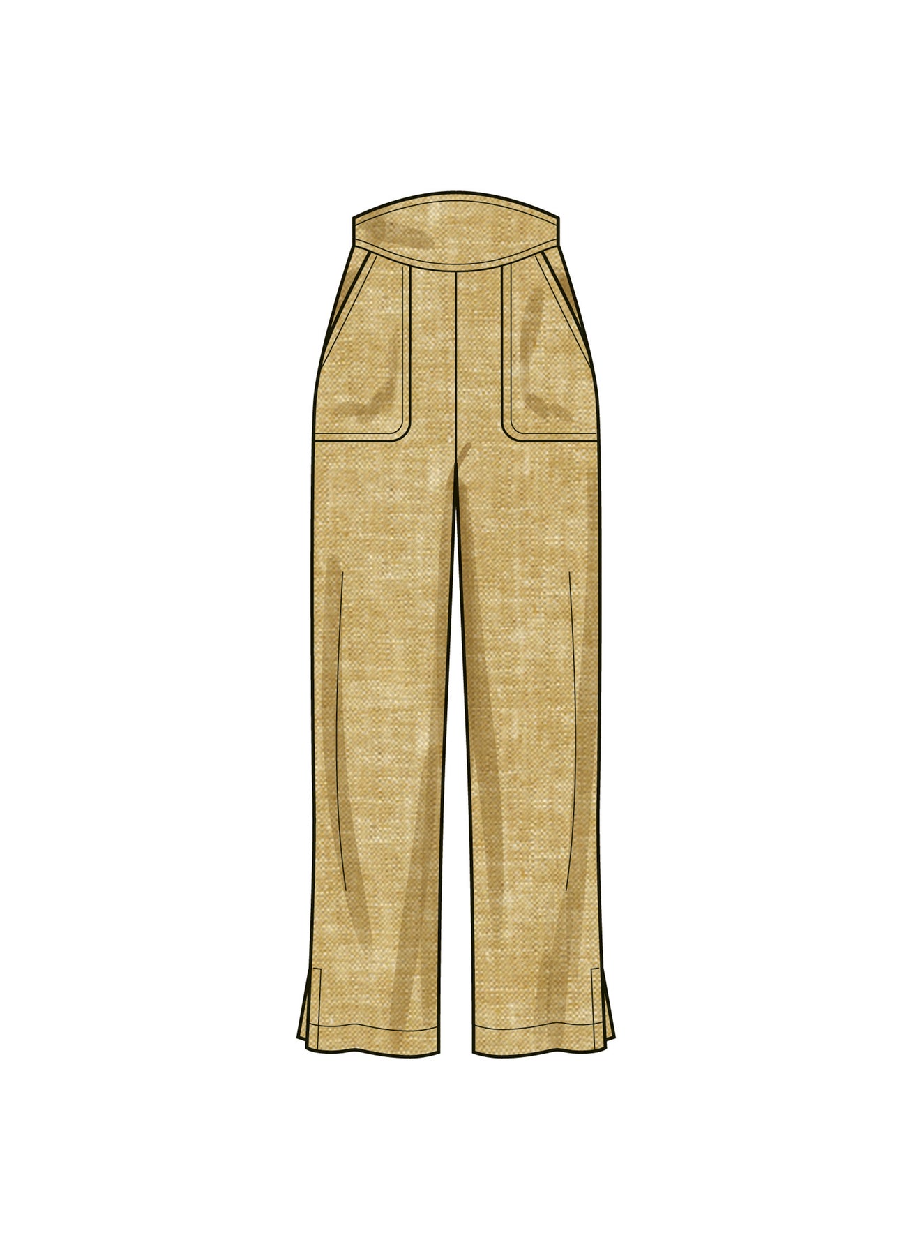 Leicht zu nähende Oberteile, Röcke und Hosen. Ärmelloses Oberteil oder Oberteil mit Puffärmel mit Knopfverschluss und Abnähern für die Formgebung. Dreistufige Röcke und Hosen mit Taschen haben einen Formbund und einen unsichtbaren Reißverschluss.