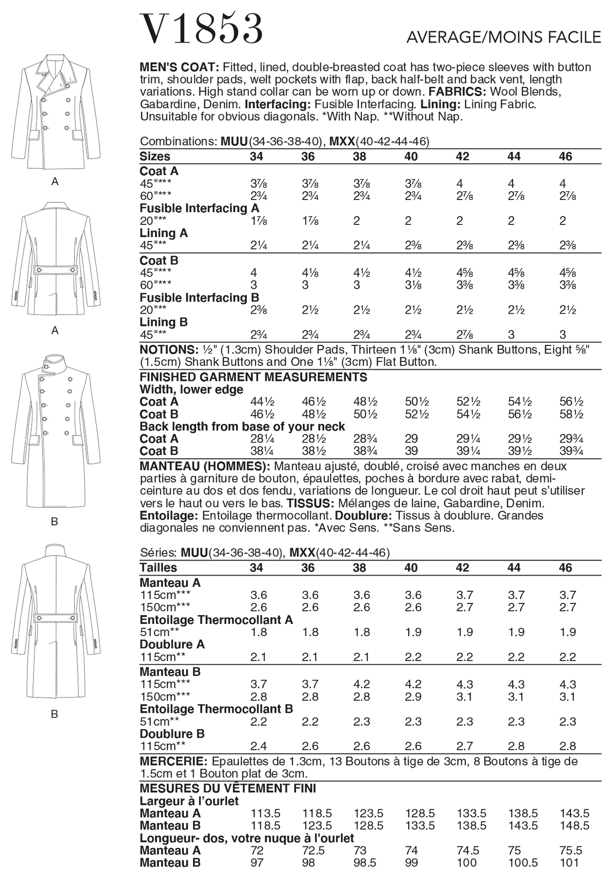 Stoffempfehlung:Wollmischungen, Gabardine, Denim. Einlage: Aufbügelbare Einlagen. Futter: Futterstoff. Nicht geeignet für offensichtliche Diagonalen. *Mit Flor **Ohne Flor ***Mit oder ohne Flor Hinweis: Der Stoff muss für Flor, einseitiges Design oder Schattierungen geeignet sein. Zusätzlicher Stoff kann erforderlich sein, um das Design anzupassen oder für Schrumpfung. ANMERKUNGEN: 1,3 cm (1/2"") Schulterpolster, zwei Ärmelköpfe, zwölf 0,3 cm (1 1/8"") Schaftknöpfe, acht 1,5 cm (5/8"") Schaftknöpfe und ein 2,8 cm (11/8"") flacher Knopf.
