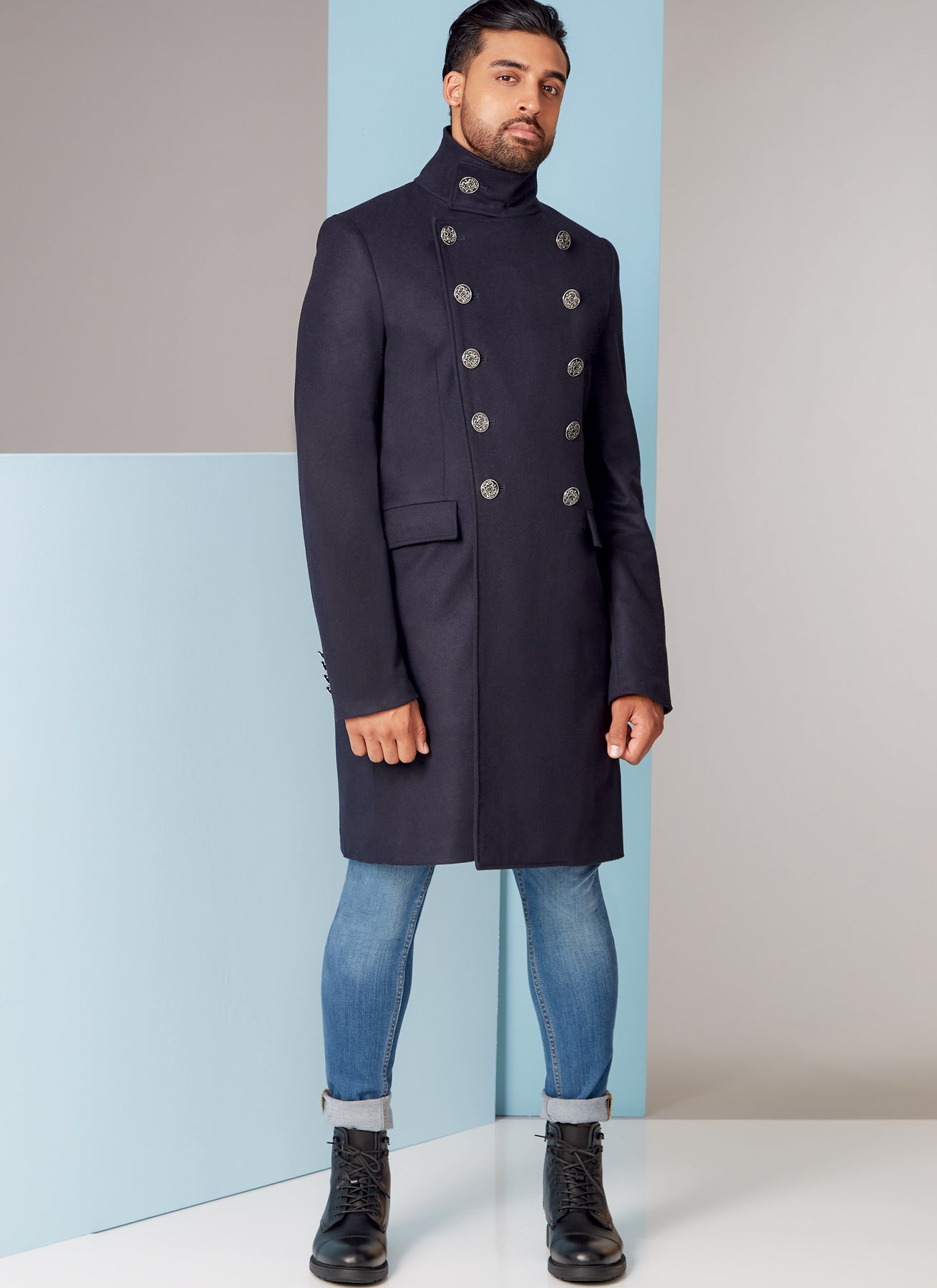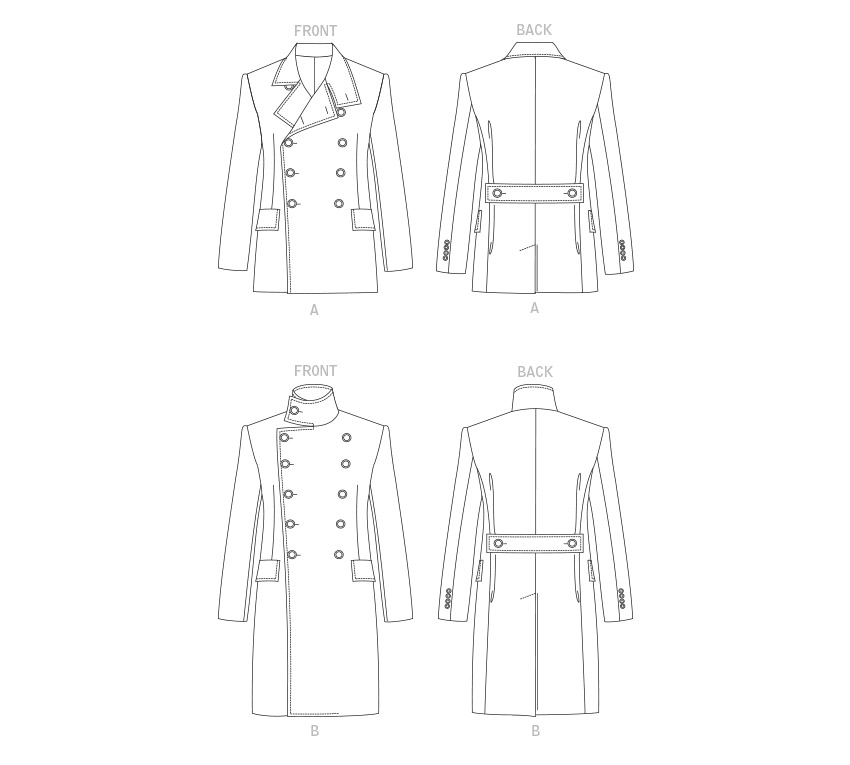 Taillierter, gefütterter, zweireihiger Mantel mit zweiteiligen Ärmeln mit Knopfleiste, Schulterpolstern, Leistentaschen mit Klappe, hinterem Halbgürtel und Rückenschlitz, Längenvarianten. Der hohe Stehkragen kann hoch oder runter getragen werden.