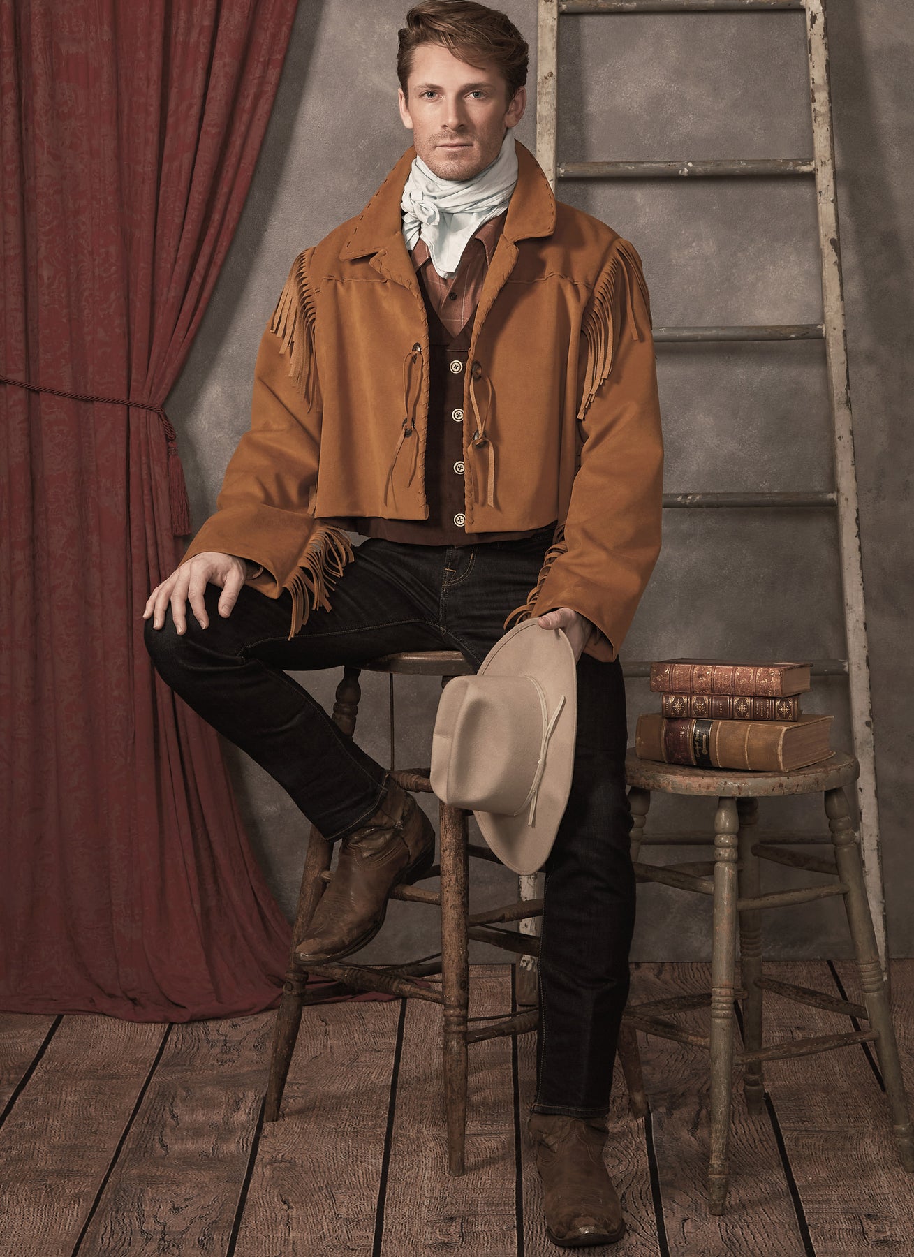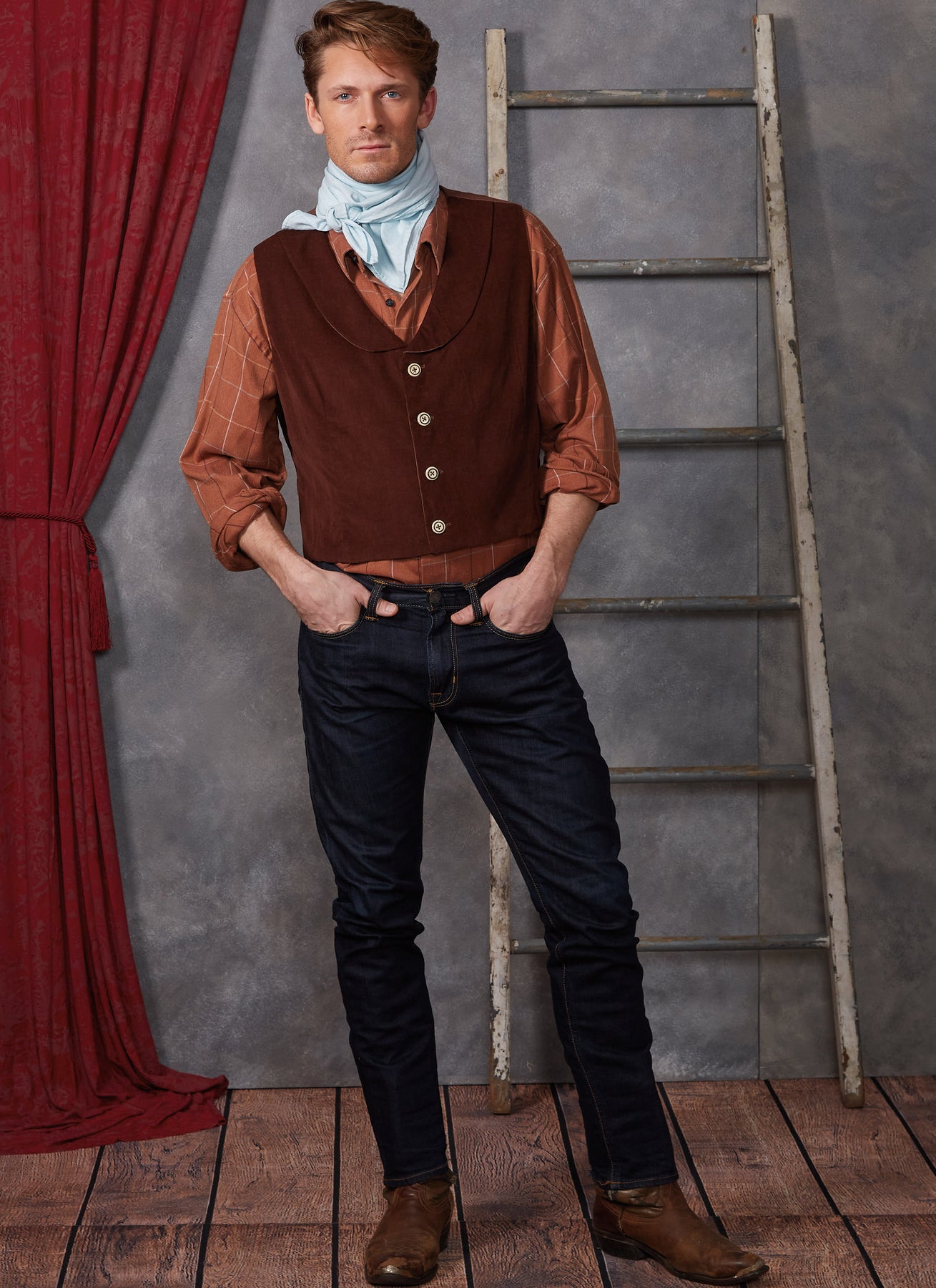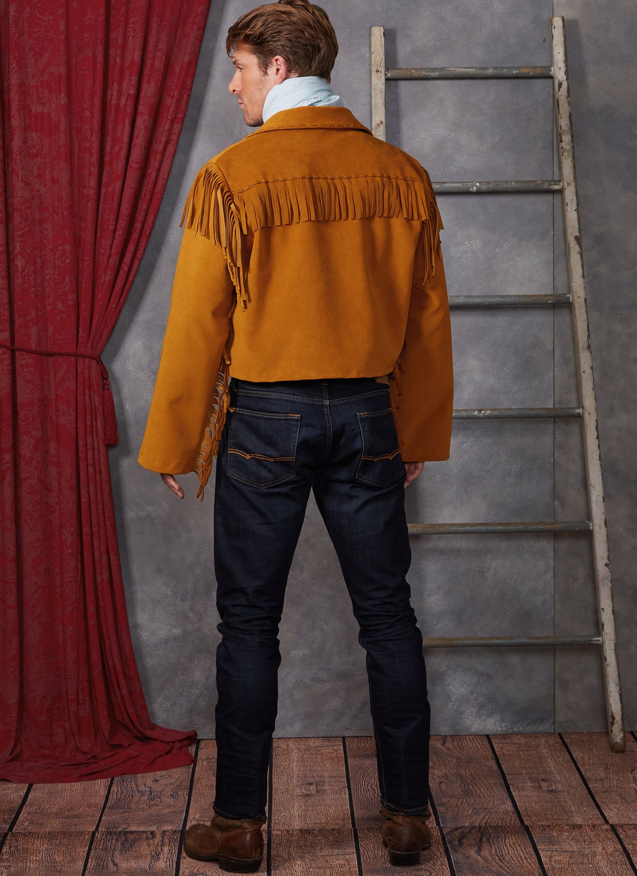 Die ungefütterte Western-Jacke beeindruckt mit authentischen Schnürungen und auffälligen Fransen an den Ärmeln, die dem Outfit einen rustikalen und stilvollen Charakter verleihen. Die sorgfältig gearbeiteten Schulter- und Rückenpaßnähte sorgen für eine optimale Passform und unterstreichen die maskuline Silhouette. Die gefütterte Weste ergänzt das Ensemble durch ihre präzisen Abnäher an der Vorderseite und den eleganten Schalkragen, der für einen klassischen Look sorgt. Mit den verstellbaren Bändern im Rücken lässt sich die Weste individuell anpassen, während die Knöpfe an der Vorderseite das Design abrunden. Das große, schmal gesäumte Halstuch setzt einen markanten Akzent und rundet das Kostüm perfekt ab. Dieses Schnittmuster bietet Ihnen die Möglichkeit, ein charakterstarkes Herren-Kostüm im Western-Stil zu kreieren, das sowohl durch Details als auch durch Tragekomfort überzeugt.